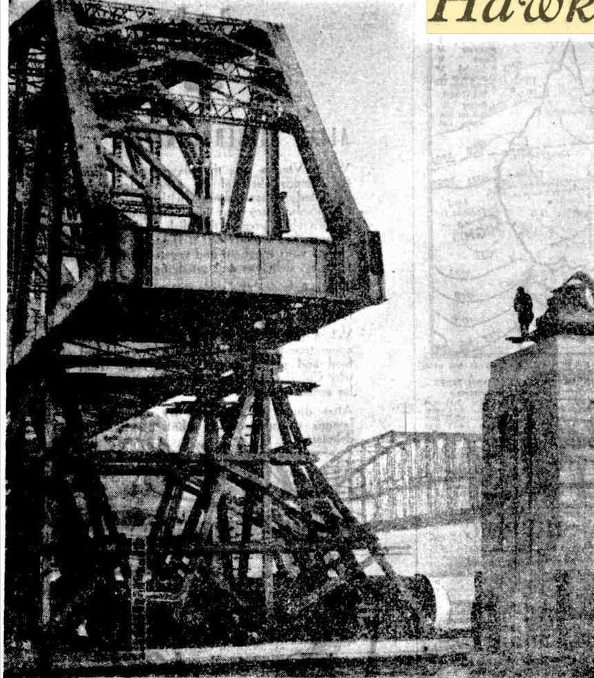 Two of the spans, 450ft long, 34ft wide, 72ft high, weighed 1,470 tons when' lifted on to the pontoons. In the construction of each 180,000 steel rivets were used. There are four spans each 375ft long, two,150ft long, and on the southern side two 75ft concrete approach spans are being built.