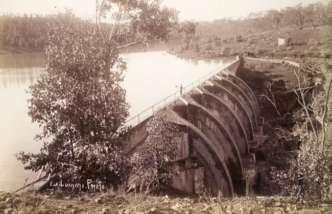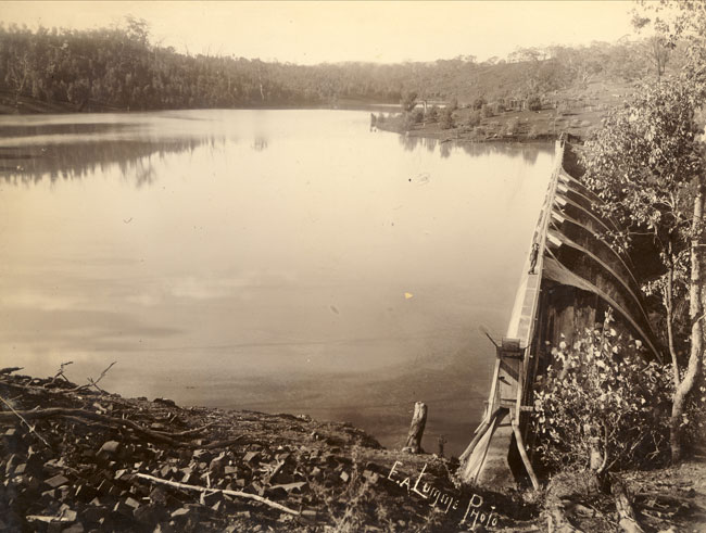 Belubla river dam from and by Evan Antoni Johann Lumme (1865-1935) from Mandurama photograph collection - held by National Library of Australia - E.A. Lumme was born in Estonia and after several years as a sailor, arrived in Australia in 1889. He worked as a professional photographer in Sydney and moved to the Lyndhurst area in 1900.
