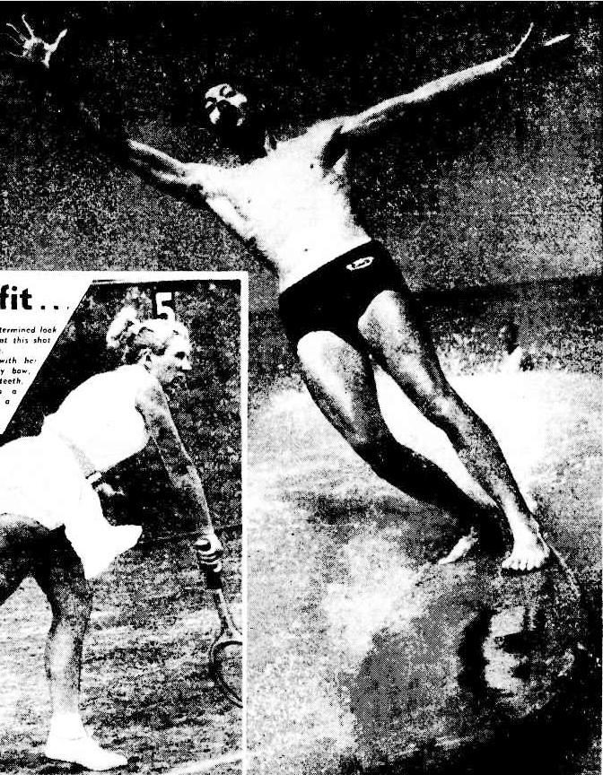 With the exception of their captain, 45-year-old Herb Barthels, their ages range from 18 to 24. They are a team of young giants. The baby of the team is 18-year-old Roger Jensen, of Malibu beach, who is 6ft. 5 ins. tall and weighs 190 lbs. Their appearance in the march past at the international carnivals should cause a sensation, because they will wear the most striking three colour parade costumes ever seen on an Australian beach. The trunks of the costumes will be a vivid red, the midriff white and the torso and shoulder straps a rich blue. On the upper front of the costume there will be the letters 'U.S.A.' in red and white and two white stars. On the back of the costumes, against the blue background, -will be five white stars.