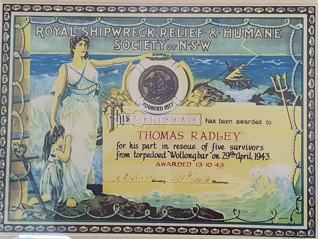 The Captain and crew of the vessel (father Capt. Thomas Radley and brothers’ Claude, Mervyn and Russell, along with Arthur Beattie and Raymond Smith) were all awarded Bravery Certificates by the Royal Shipwreck Relief and Humane Society of NSW for their efforts in rescuing the survivors despite the grave peril they placed themselves in by doing so [2.].