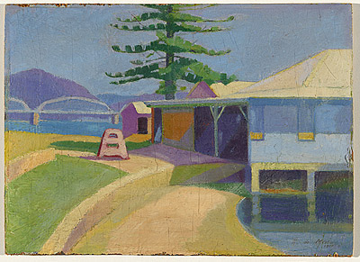 Family life and the environs of Mona Vale became important motifs of Hawkins’ work. Then Mona Vale was an area of natural bush, tropical vegetation, market gardens and semi rural suburbs. The peaceful and verdant rendition of the area in A view of Newport, 1943 does not give insight into the harshness of the Australian climate or into the war time austerities that Hawkins was living under at the time. His fixed British war pension did not take into consideration the high war time inflation and the family had to rely on their garden to provide them with fruit and vegetables and chickens!