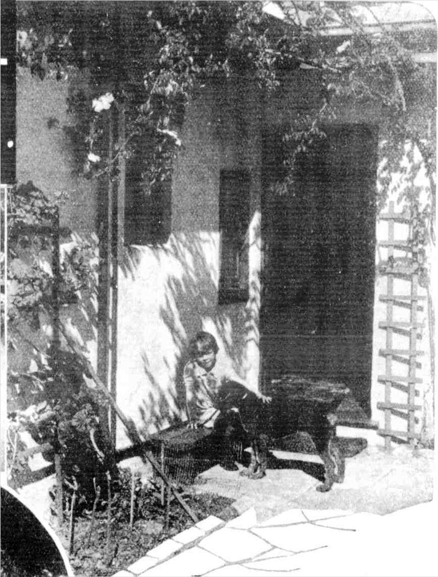 Jacqueline Jackson with Dusty at the rose-hung doorway of the lovely home of Mr. and Mrs. James R. Jackson, on a Seaforth cliff above The Spit.