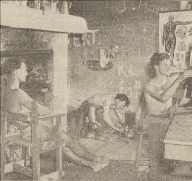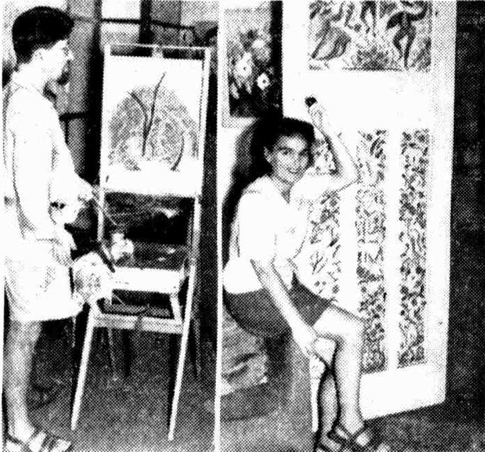 Above Right: MR. and MRS. WEAVER H. HAWKINS are among the oldest members of the Mona Vale art "community." While her husband discusses a new painting Mrs. Hawkins paints the door of their studio.