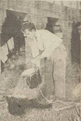 Above: MR. and MRS. PAUL H BEADLE and their sons TIMOTHY and ANTHONY live at Narrabeen where Mr. Beadle, a sculptor, has built an outdoor workshop. His wife is always on call to provide cups of tea.