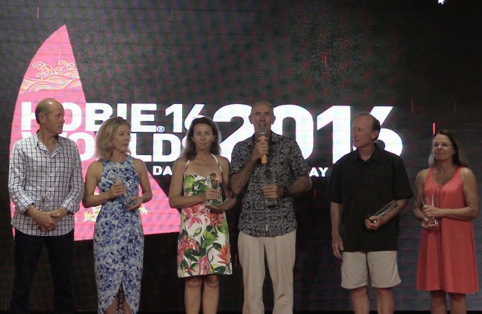Mother and daughter, Evelyn and Nina Curtis with Haylee Outteridge(right) - the girls took second overall in the Women's 2016 Hobie Worlds, while Evelyn also took second inthe Grand Masters - at the Presentation Dinner
