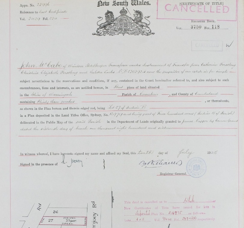 John McCabe block - he sold to John Laughlan Ellis January 1954 - from NSW Land Registry Services HLRV Vol-Fol 3750-118