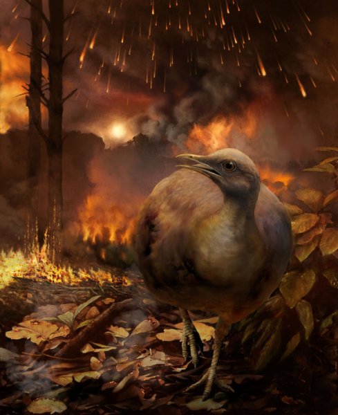 The asteroid impact that eliminated non-avian dinosaurs destroyed global forests. Here, a hyopothetical surviving bird lineage -- small-bodied and specialized for a ground-dwelling lifestyle--flees a burning forest in the aftermath of the asteroid strike. Credit: Phillip M. Krzeminski