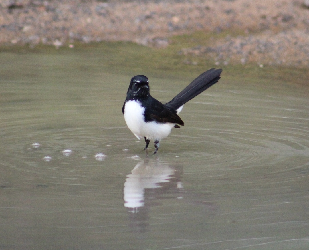 Willie Wagtail (Rhipidura leucophrys), Rainbow Lorikeet (Trichoglossus moluccanus) and White-faced Heron (Egretta novaehollandiae) enjoying food the rains bring - Careel Creek track behind BHS June 27th, 2018.
