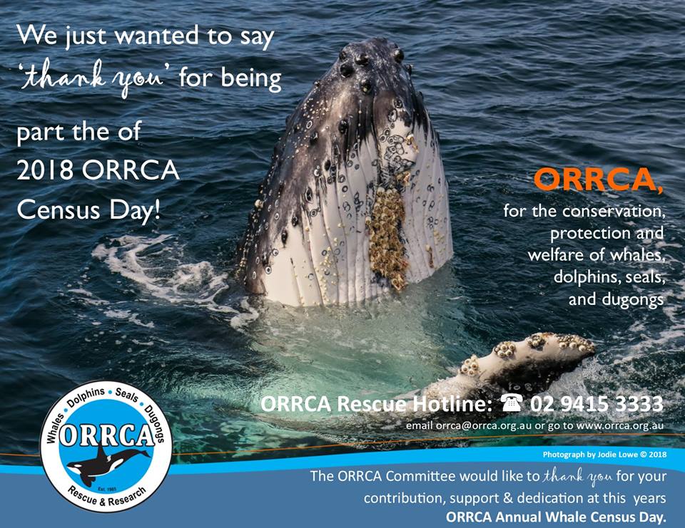 Once again, thank you for your ongoing support!SAVE the DATE: The next ORRCA Annual Whale Census Day is proposed for 30th June 2019 (next year)