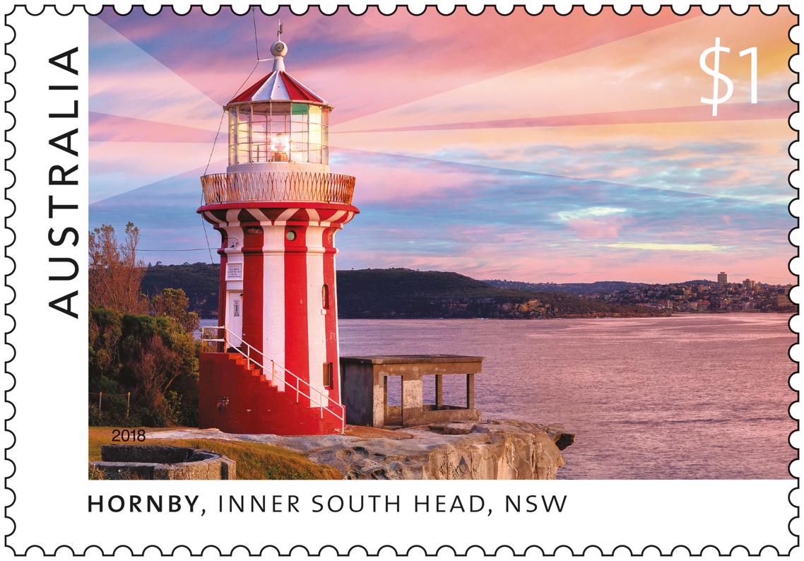 Hornby Lighthouse, with its impressive red and white stripes, was constructed in 1858, following two shipwrecks at The Heads in 1857. The stamp photograph is by Bruce Hood.