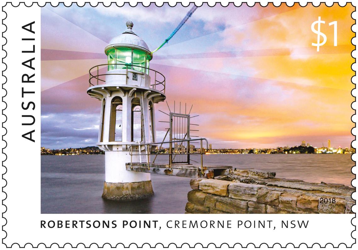 Roberstons Point Lighthouse sits in the shores of Sydney Harbour. Constructed in 1910, the tower is an early example of the use of reinforced concrete in Australian lighthouse construction. The stamp photograph is by Ryan Payne.