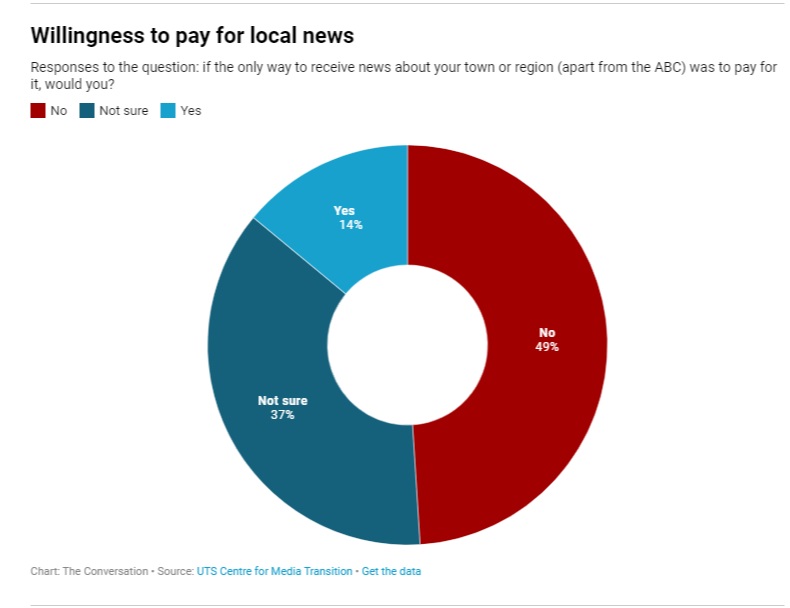 That unwillingness to pay for online content may change if it’s the only way to get local news. Attitudes to online subscriptions are shifting, and people do value local news. Research commissioned for the Australian Competition and Consumer Commission’s Digital Platforms Inquiry found 71% of the population rated it as important as national news for social participation.