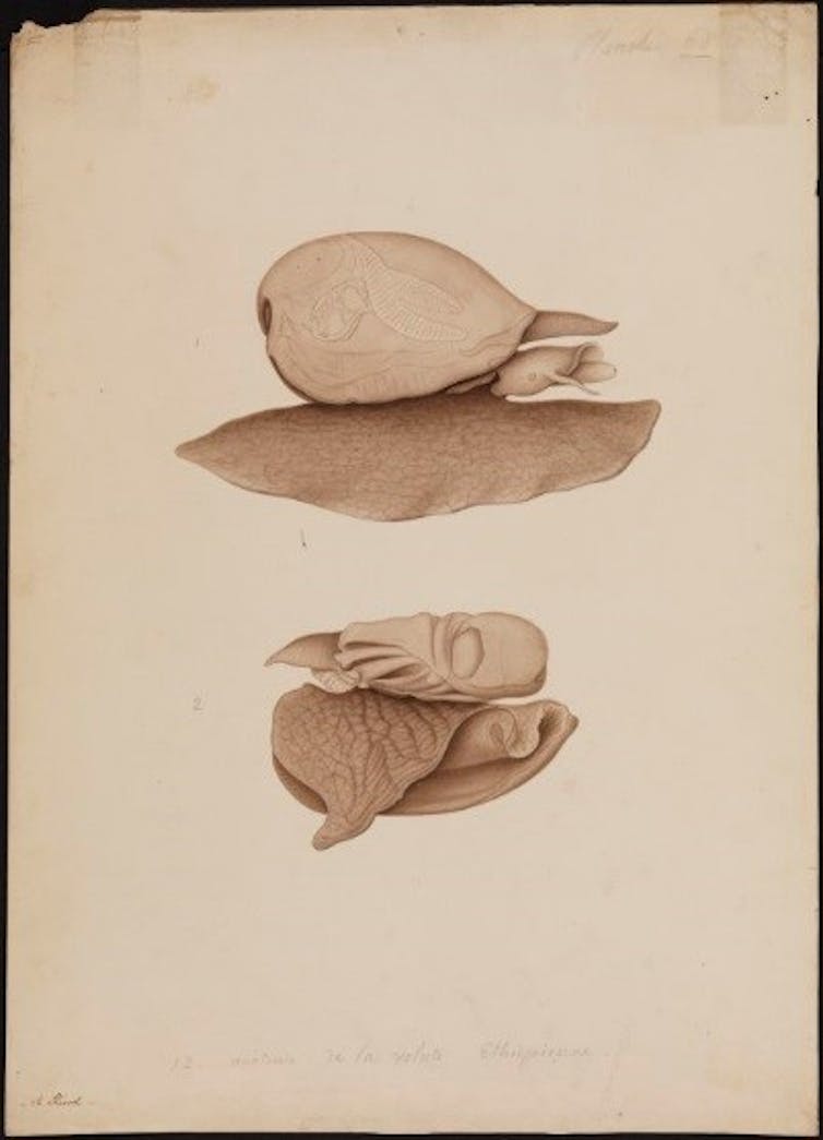 This watercolour and ink drawing of a beautiful shell — the Volute ethiopienne — was drawn from a specimen brought back from Shark Bay in 1820 as part of the French Freycinet expedition. It can now be found in the State Library of Western Australia.