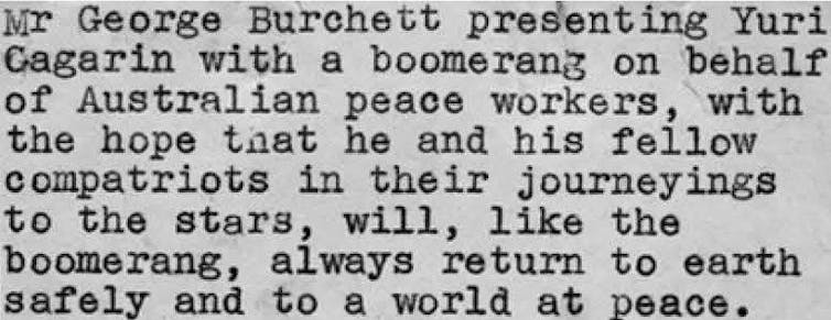 Burchett’s father George was on holidays in Moscow at the time. Just as Gagarin was leaving, George walked in with a boomerang he had in his luggage. He offered it to the cosmonaut, saying “please take this as a symbol of safe return”.