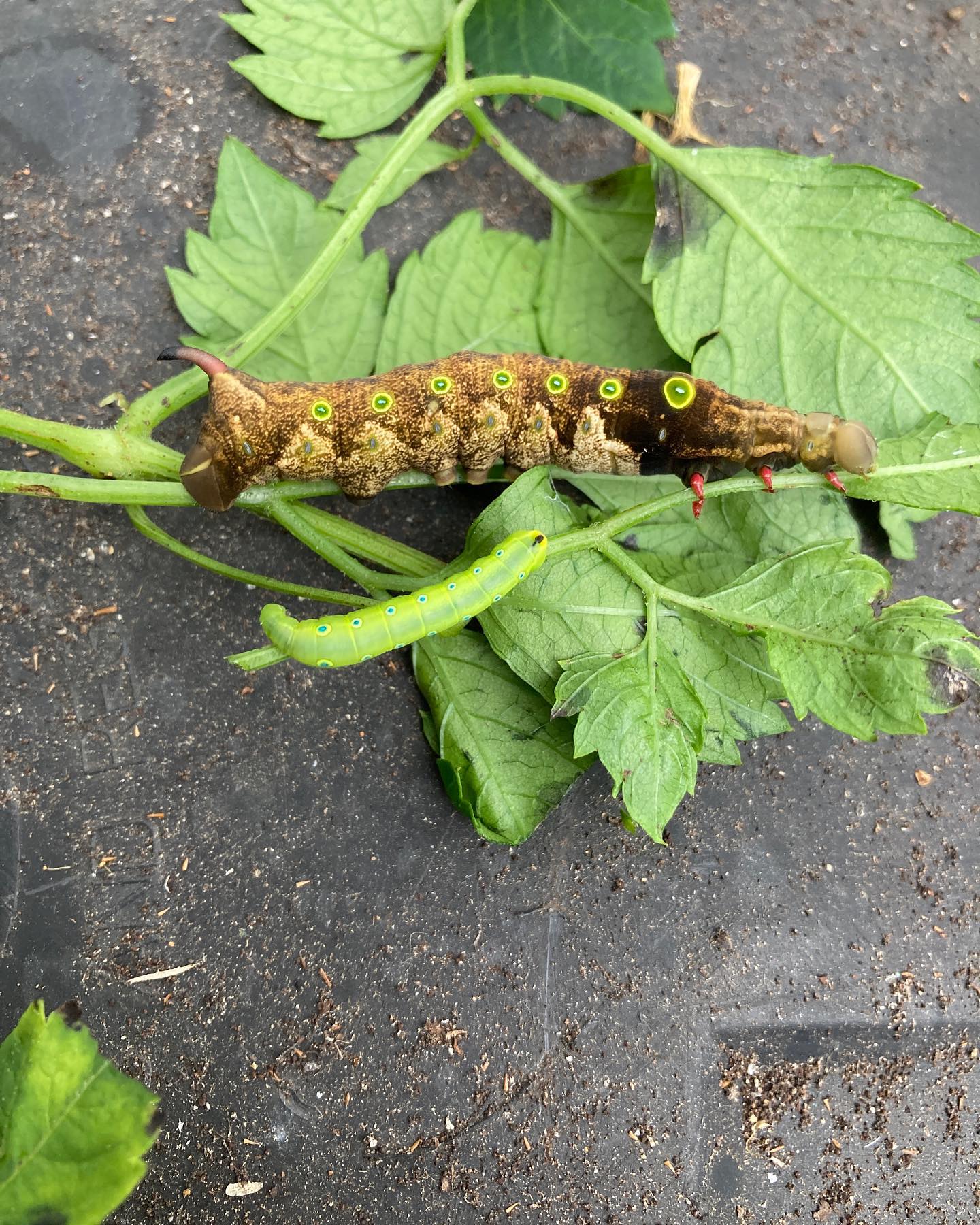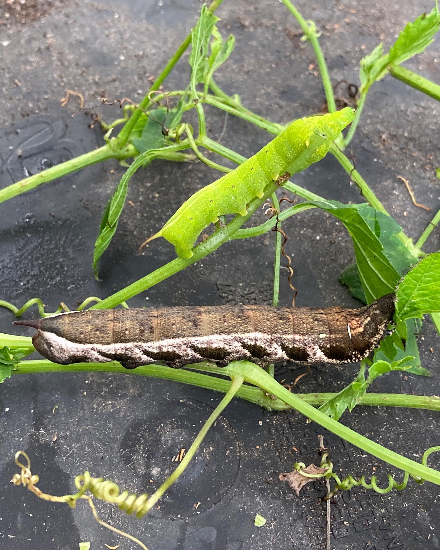 These are Hawk Moth caterpillars on food plant Cayratia. Young ones camouflage by being green, older ones change to browns. Theretra indistincta has bright green spots on its spiracles where it takes in oxygen along its sides. Theretra latreillii’s spiracles just look like dots. Cayratia aka Native Grape grows madly in this weather but watch out for these lovely grubs before you clear it too energetically.