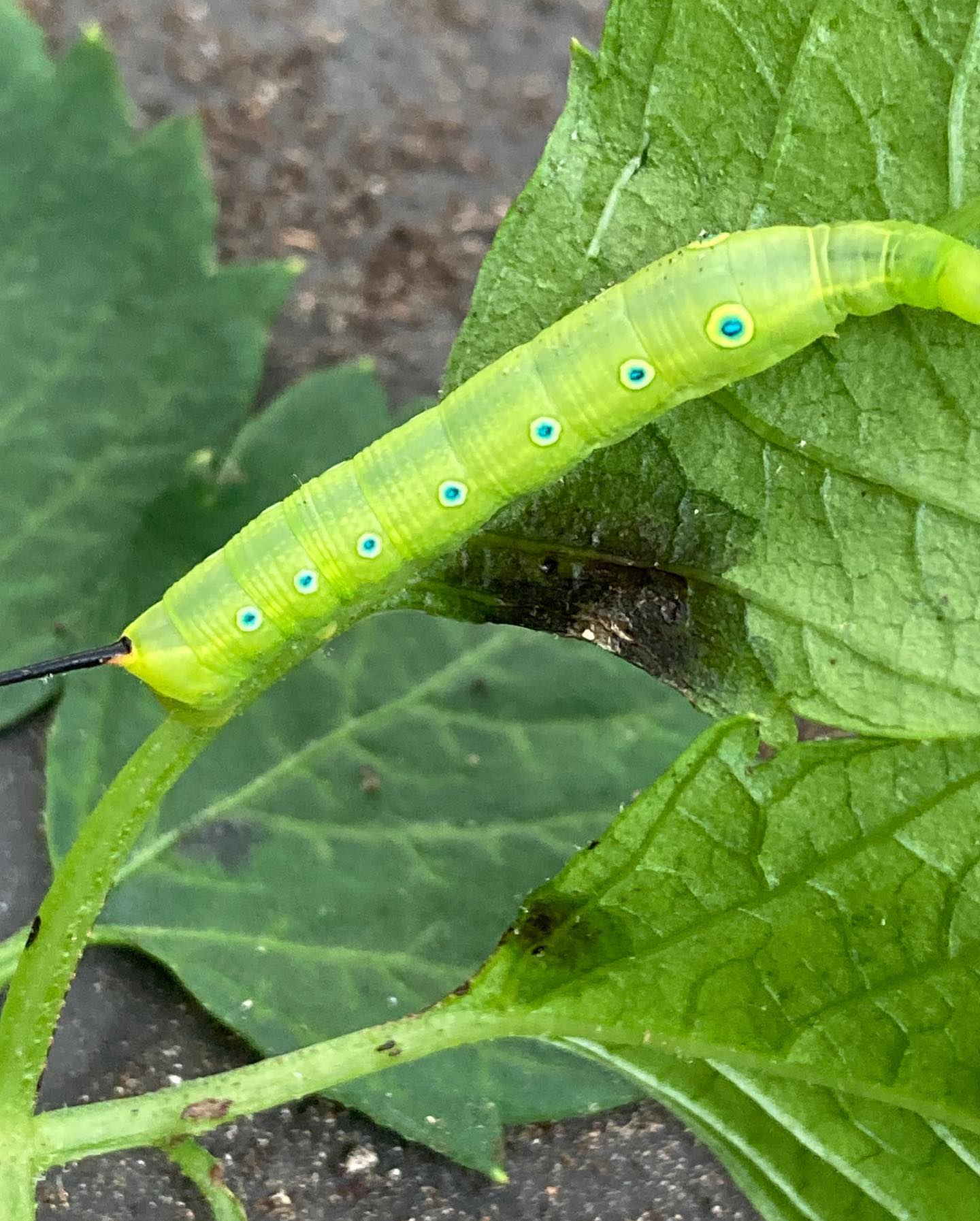 The larvae (caterpillars) are large and often colourful, usually with a long horn near the end of the body. Many have lateral stripes and/or large eye spots on the thorax and abdominal segments. The colour patterns help to camouflage the caterpillars and the large eye spots may assist in warding off predators. The caterpillars don't bite or sting but may regurgitate green fluid (from a previous meal) if annoyed.