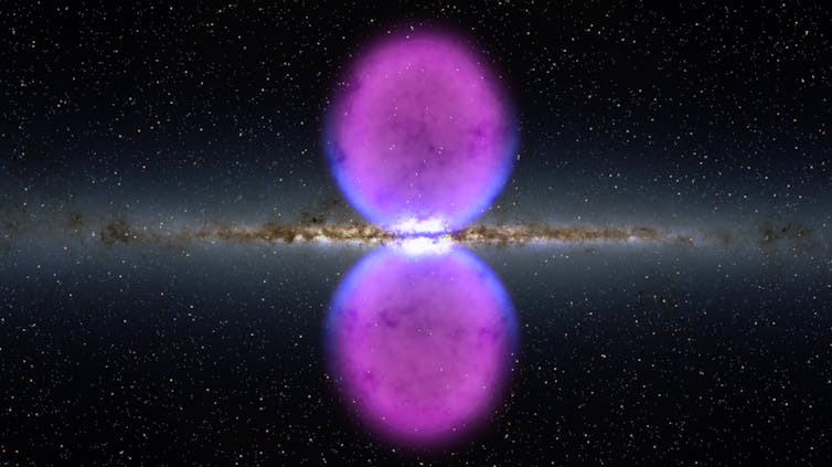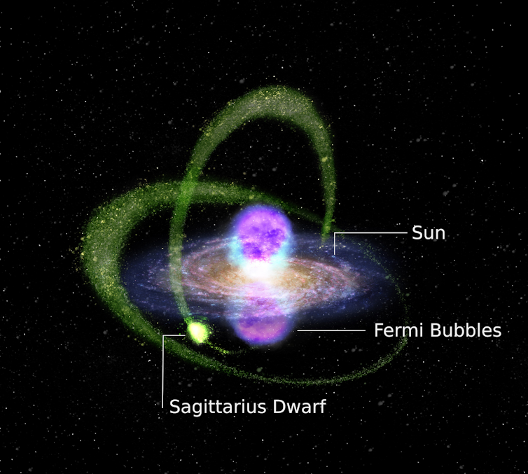 In new research published in Nature Astronomy, we show the cocoon is caused by gamma rays emitted by fast-spinning extreme stars called “millisecond pulsars” located in the Sagittarius dwarf galaxy, which orbits the Milky Way. While our results clear up the mystery of the cocoon, they also cast a pall over attempts to search for dark matter in any gamma-ray glow it may emit.