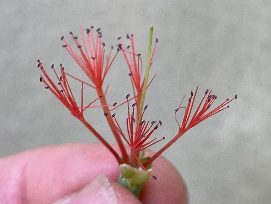 They have fluffy flowers because their many stamens grow five bundles on each flower. Photos; Small tree Snow in Summer aka Melaleuca linariifolia is white, flowers attracting lots of insects, in Warriewood Rd, and Etival St Avalon. Hillock Bush aka Melaleuca hypericifolia a sprawling shrub is dusty red.
