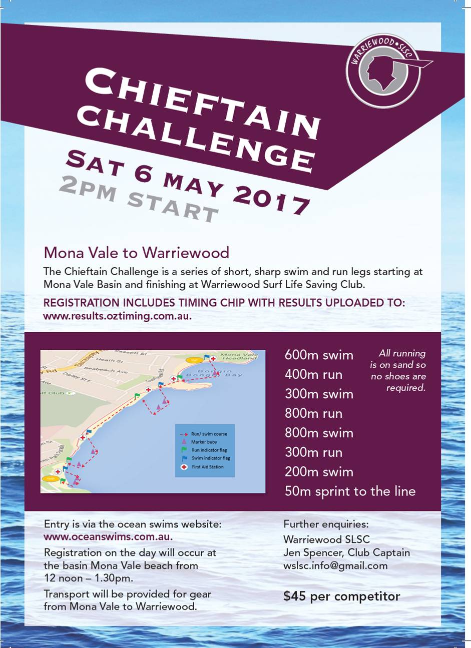 The Chieftain’s Challenge is a highly achievable run-swim-run from Mona Vale to Warriewood on Sydney’s northern beaches. The course consists of four ocean swims broken up by three runs. The total course distance is approx 3.4km, that includes 1.9km of ocean swimming and 1.5km of running.