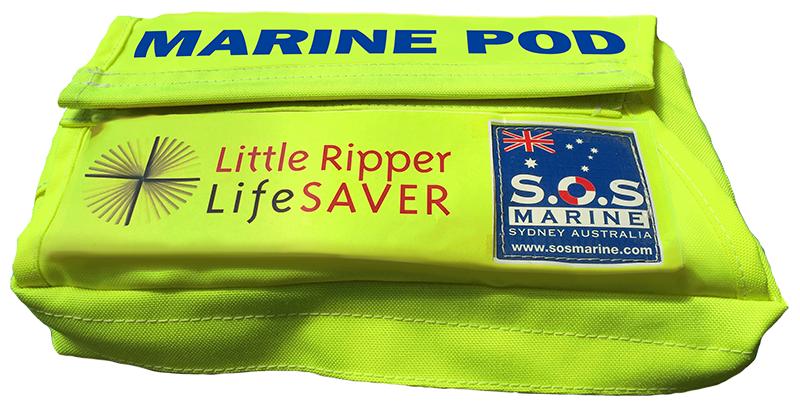 The Little Ripper developed and designed ULB Marine Pod© contains: a water activated inflatable lifebuoy; SharkShield electromagnetic shark repellent; whistle; and sea anchor.