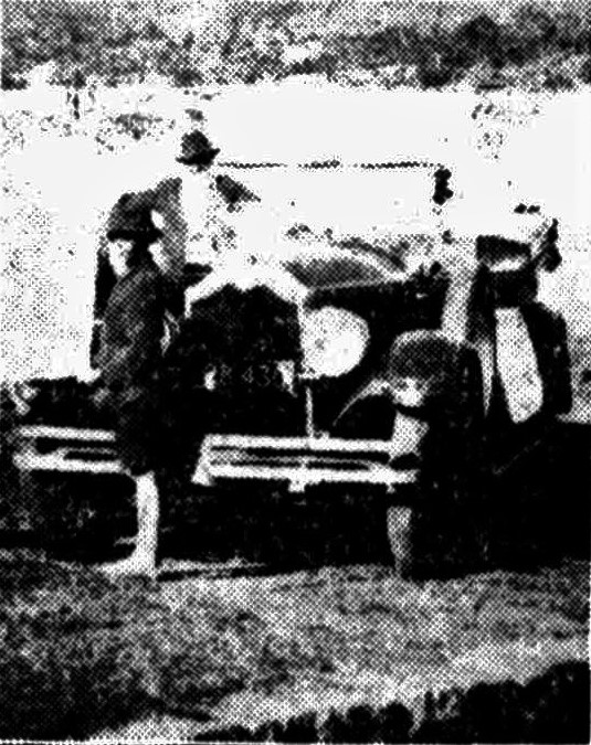 For the first few miles on the other side they travelled with little difficulty, but their troubles began when they ran into thick scrub and rocks, and were faced with stiff ascents. Four miles from Peat's Ferry they saw no hope of getting further for the day, and struck camp. They had no provisions; so they spent what should have been the meal hour cutting scrub to make a track for the car in the morning, working with the aid of headlights. Early on Sunday they were off again, but several times the car was bogged. Mud was dug away, stones were laid as a foundation for the jacks, and the car was levered out each time. Once, all four wheels were down to the axels, and it took three hours to get out.
