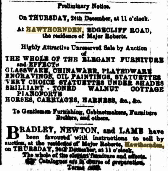 Why 'Hawthornden'? - the property was originally owned by a Major Roberts, who in 1874 was leaving - his property soon to become Edward Augustus home for his children: