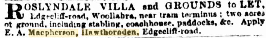 MACPHERSON.—December 7, at Hawthornden, Edgecliff-road, Woollahra, the wife of E. A. Macpherson, of a son. Family Notices (1885, December 19). The Sydney Morning Herald (NSW : 1842 - 1954), p. 1. Retrieved from http://nla.gov.au/nla.news-article13607015