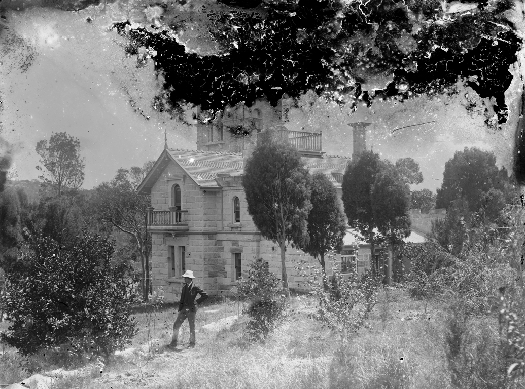Including the Garden House of 'Hawthornden', Woollahra (no's. 1-3), stone gates of 'Hawthornden' (no. 4), 'Hawthornden', Woollahra (no's. 5-6), Box 03: Glass negatives of the Sydney and Blue Mountains regions, ca 1890-1910. Images No.: c071770004, c071770003, c071170004H, c071170002H (Garden House), c071170001 (Garden House - girls tapping in sign which reads 'Norena' - sisters Lucy and Effie or William's wife and his mother?), c071170005, c071770008 and c071170006H - courtesy State Library of NSW