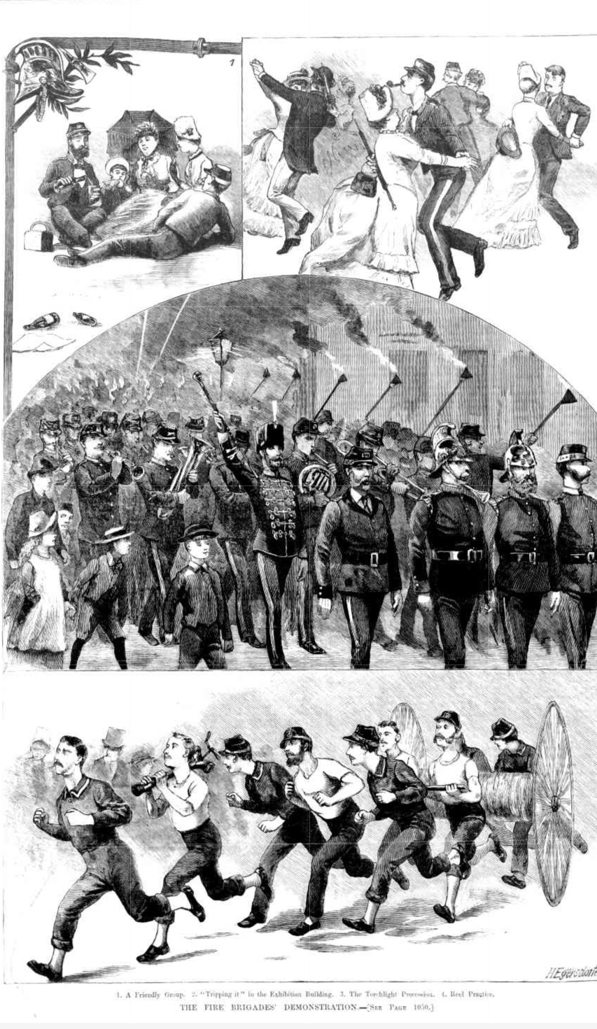 1. A Friendly Group. 2. 'Tripping it' in the Exhibition Building. 3. The Torchlight Procession. 4. Reel Practice. THE FIRE BRIGADES' DEMONSTRATION. Fire Brigades' Demonstration. (1886, November 20). The Sydney Mail and New South Wales Advertiser (NSW : 1871 - 1912), p. 1050. Retrieved from http://nla.gov.au/nla.news-article164376643
