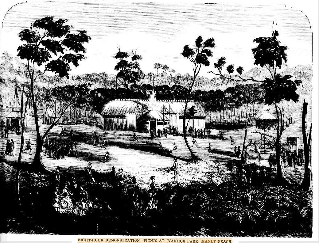 EIGHT-HOUR DEMONSTRATION-PICNIC AT IVANHOE PARK, MANLY BEACH. THE MONTH. (1872, March 19). Illustrated Sydney News (NSW : 1853 - 1872), p. 1. Retrieved from http://nla.gov.au/nla.news-article63618556