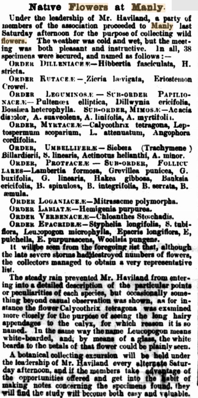 Native Flowers at Manly. (1889, June 8). The Sydney Mail and New South Wales Advertiser (NSW : 1871 - 1912), p. 1203. Retrieved from http://nla.gov.au/nla.news-article161933145