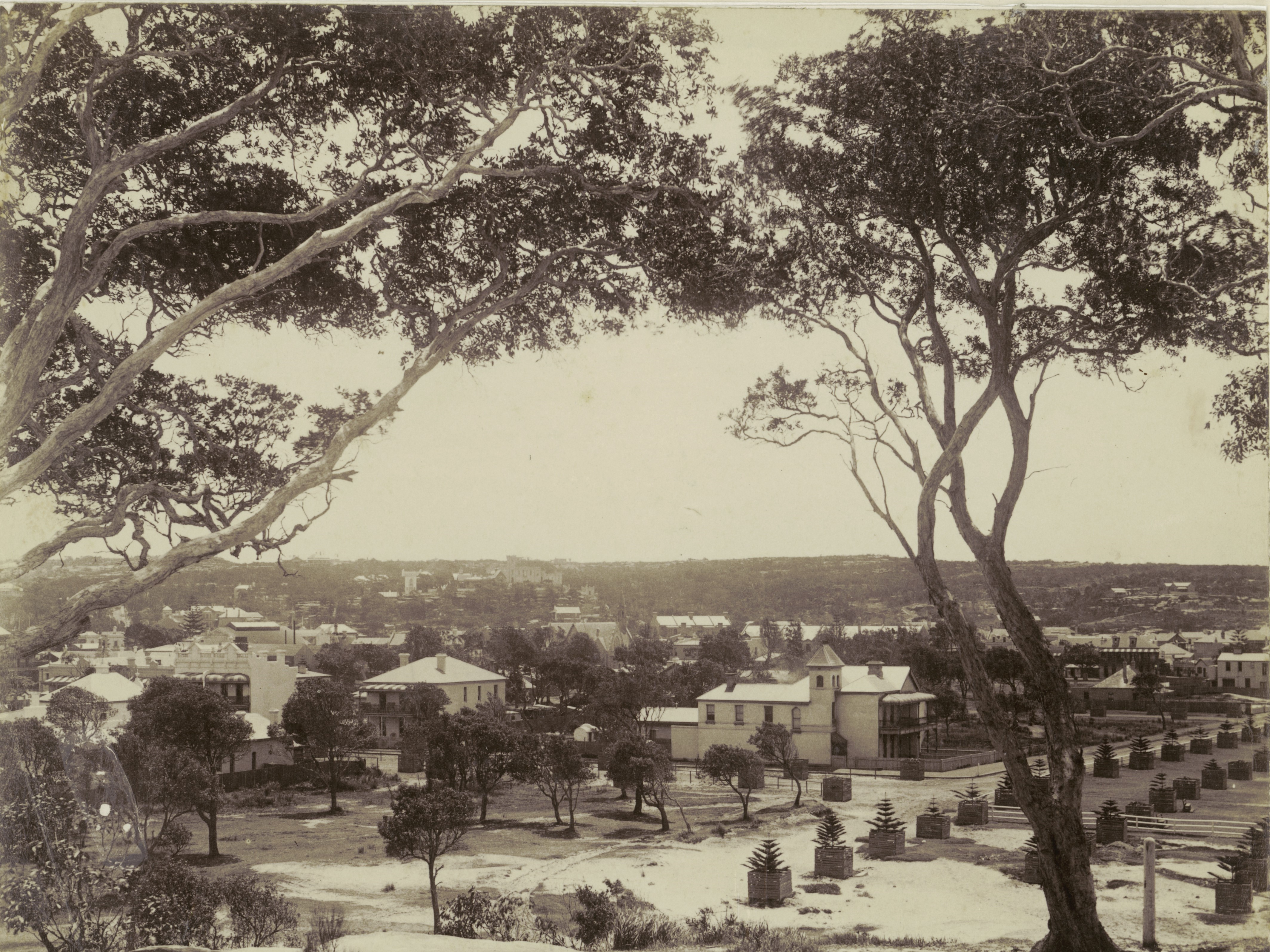 View of Manly, circa 1881-82, courtesy State Library of New South Wales In the foreground, residences and pines protected by tree guards; Looking toward 'Marinella' (Dalley's Castle, built in 1881 for William Bede Dalley) at centre, Item: SLNSW_FL1230056