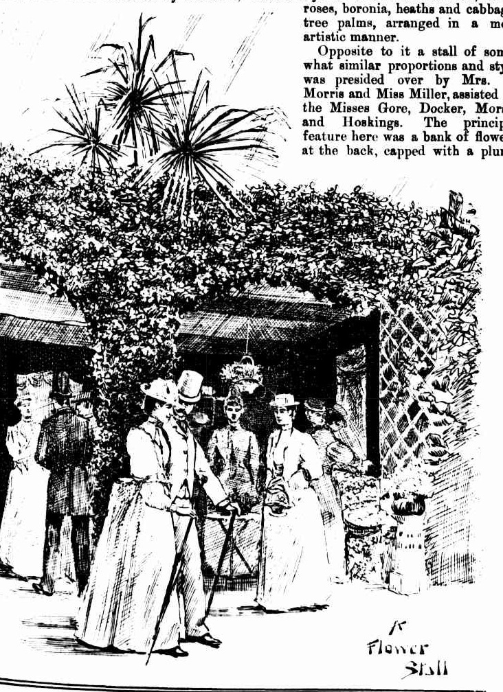 Q-rsice bouquets and baskets of flowers were shown, and also the novel device of two crowed tennis bats worked in flowers. The stall next in order to this 5 was that of Mrs. Medcalfe and Miss Underwood. There were several novelties, such as a parasol of flowers and a Union Jack worked in native roses, white forget-me-not, and blue flowers.