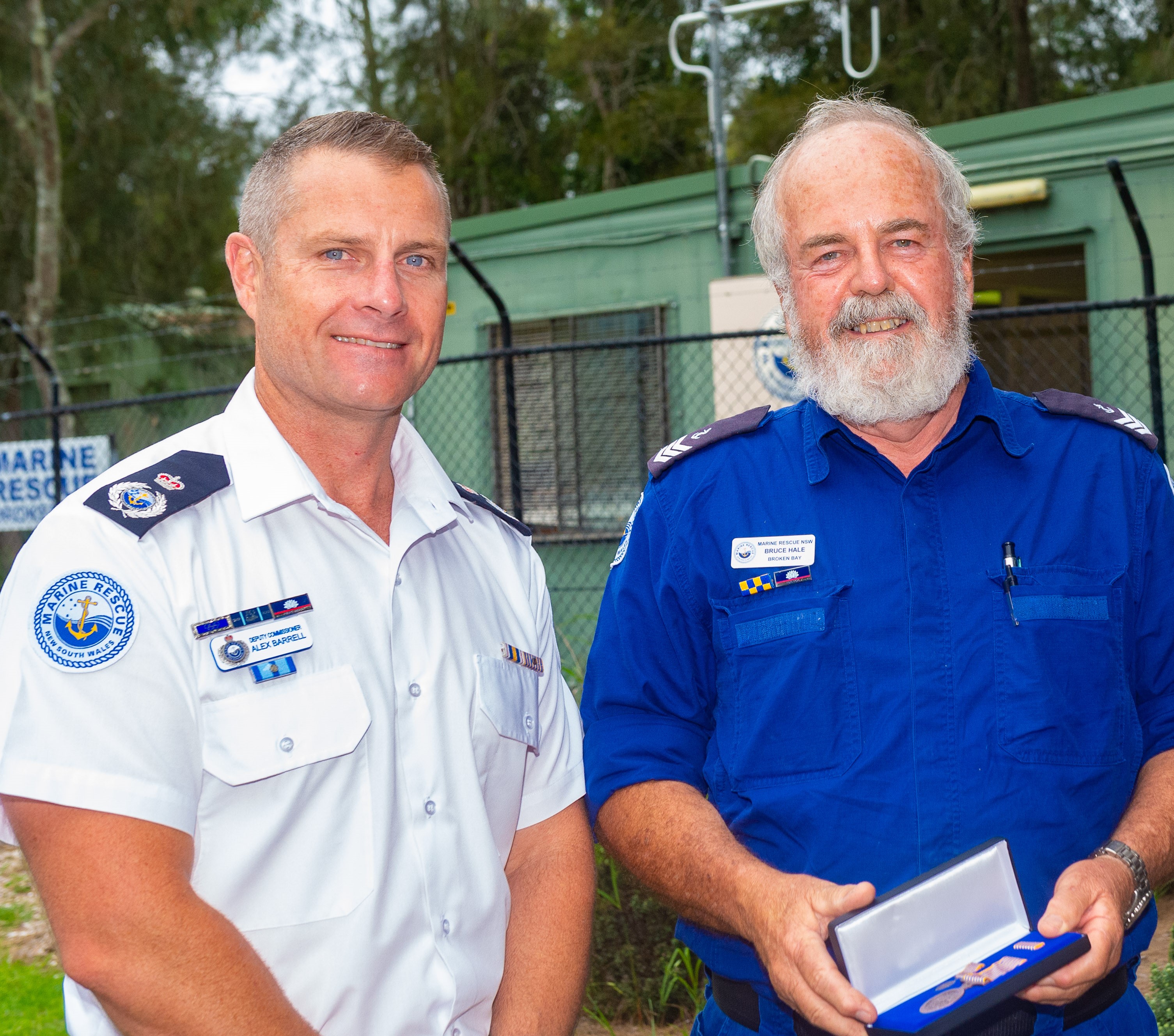 Congratulations to Bruce Hale on achieving 15 years service medal and pin with MRNSW, presented by Deputy Commissioner Alex Barrell. Photo: Michael Mannington, Community Photography