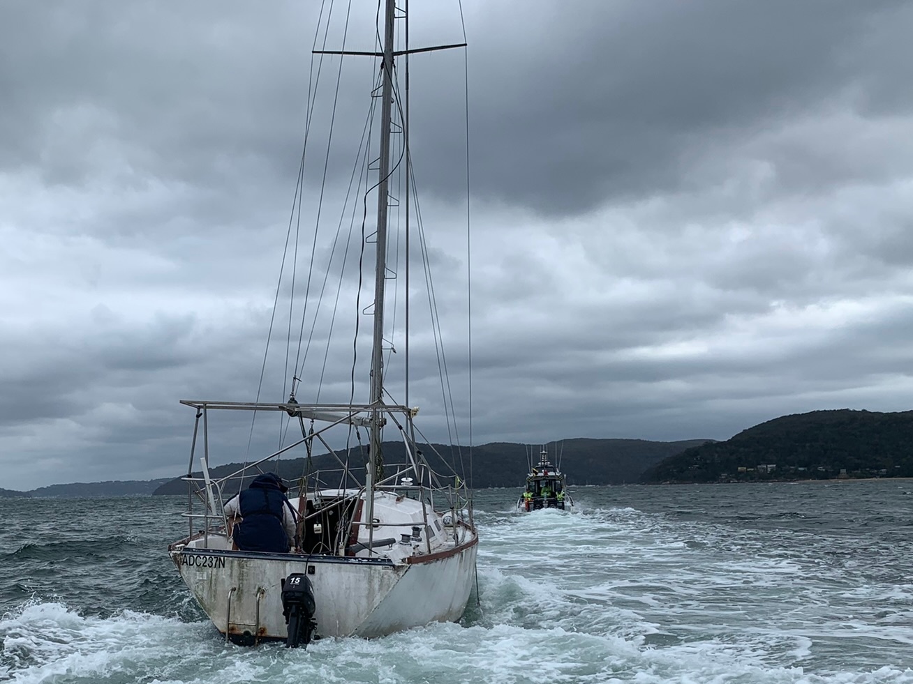 Rescued yacht being towed into Pittwater. Marine Rescue Broken Bay photo.