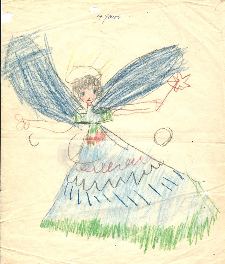 For the first ten years I lived at Artarmon where the streets were lined with date palms and lemon scented gums, and the kids drove billy-carts made from fruit boxes with any sort of wheels attached to them down pathway s and slopes. Nobody locked their backdoors in those days and the kids would play together outside until being called in for tea. A lot of fun was up the camphor laurel tree we had in the back garden after cicadas, green grocers, yellow mundey's and flowery bakers, and the boys would rattle and squeeze them to see if they were pizzas or double drummers, or block off the gutters when it had been raining and float boats made out of match boxes down the rushing water. When I wasn't doing this I was always drawing, my mother always keeping me supplied with paper and coloured pencils, usually drawing birds, flowers, butterflies and cats, I think I must of been fixated with fairies as a drawing that I did at age four still exists today.