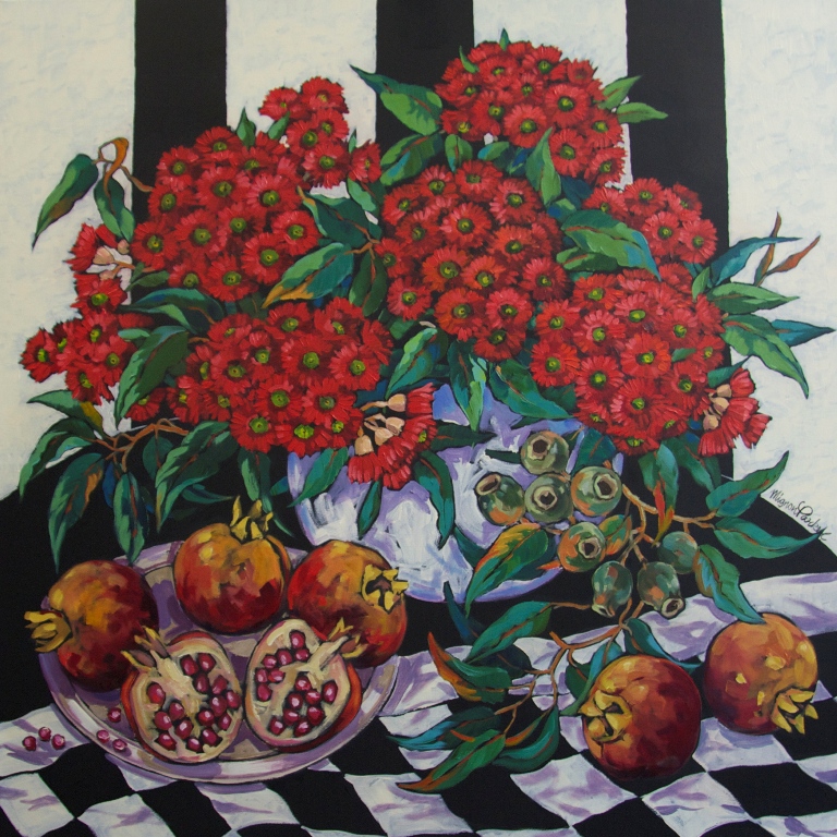 Renowned for her adaptability and prowess in numerous mediums; watercolour, acrylic, oil, rust oxidisation, patinas and encaustic, Mignon Parker is famous for her wonderful paintings of bush flowers. An Elanora Heights resident for decades, her work is infused with a connection to the bush surrounding her home.