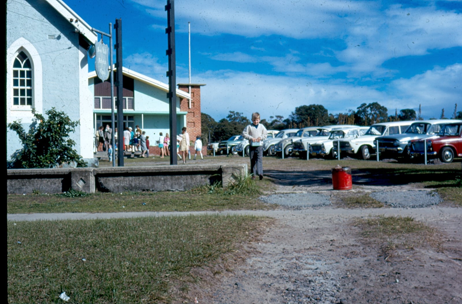 Photo circa 1967. Long-term resident Dave Murray coming out of Sunday School at the Methodist Church, Mona Vale. Behind all the parked cars was a horse paddock, which is where Woolworths is now. Photo: Dave Murray.