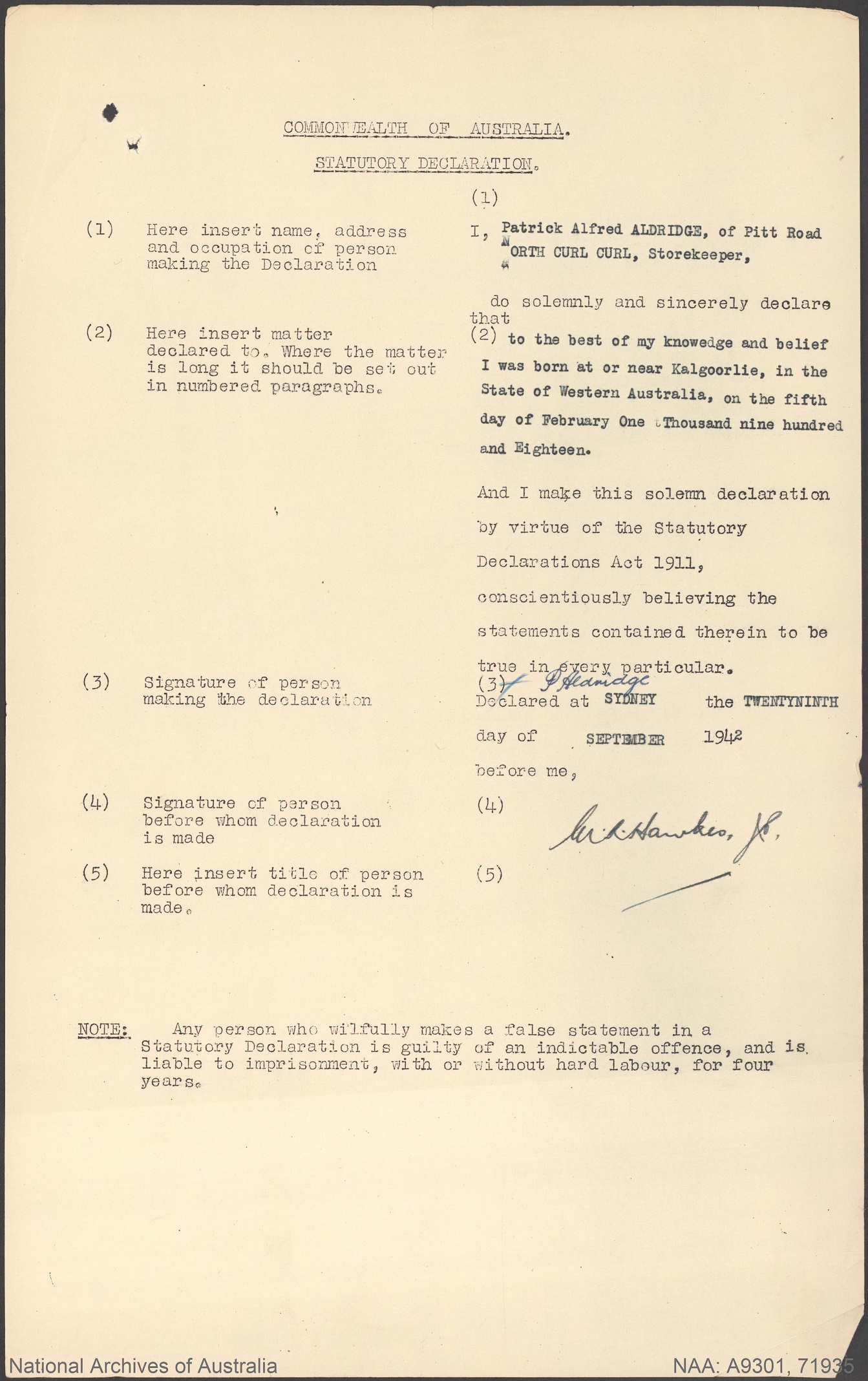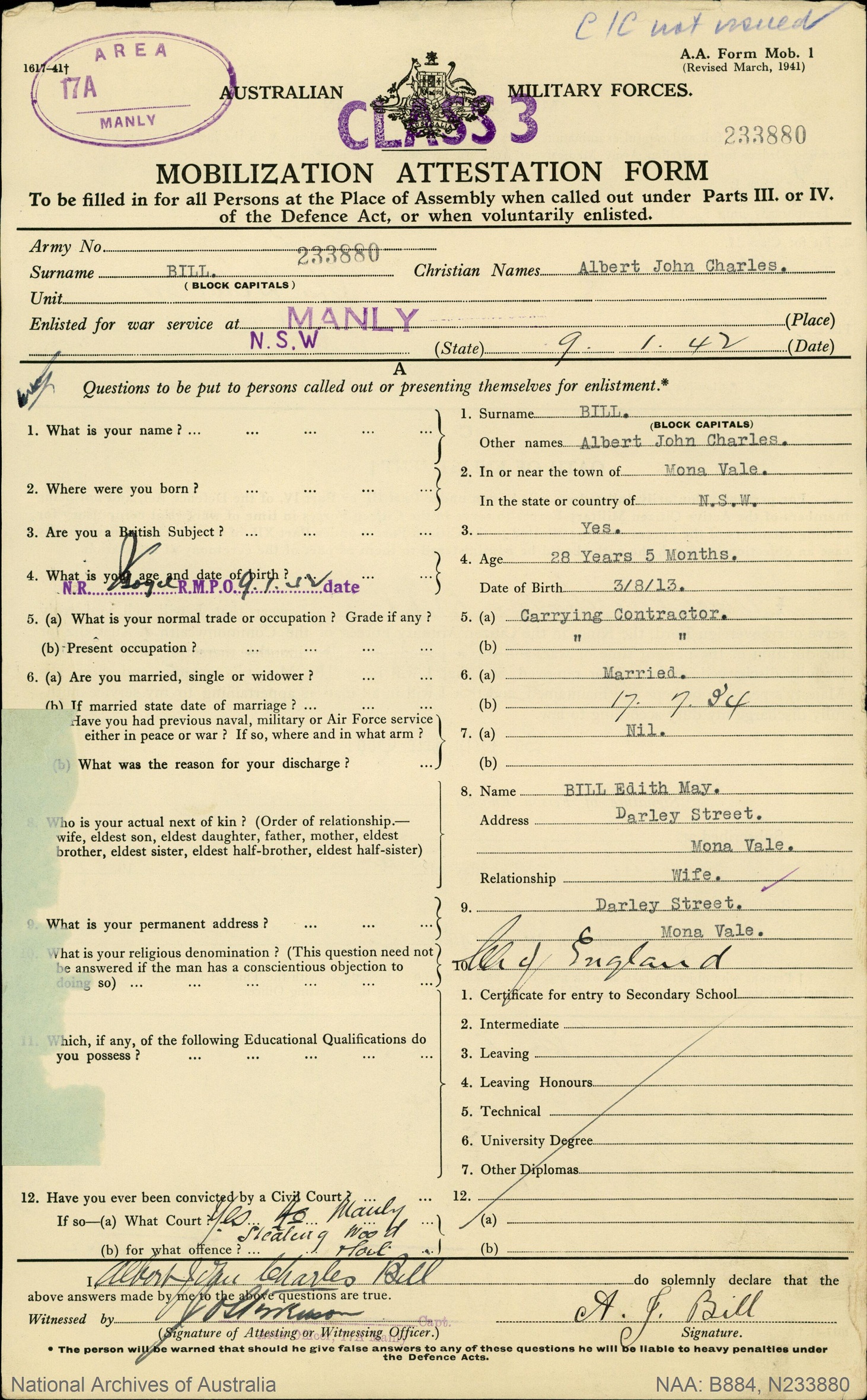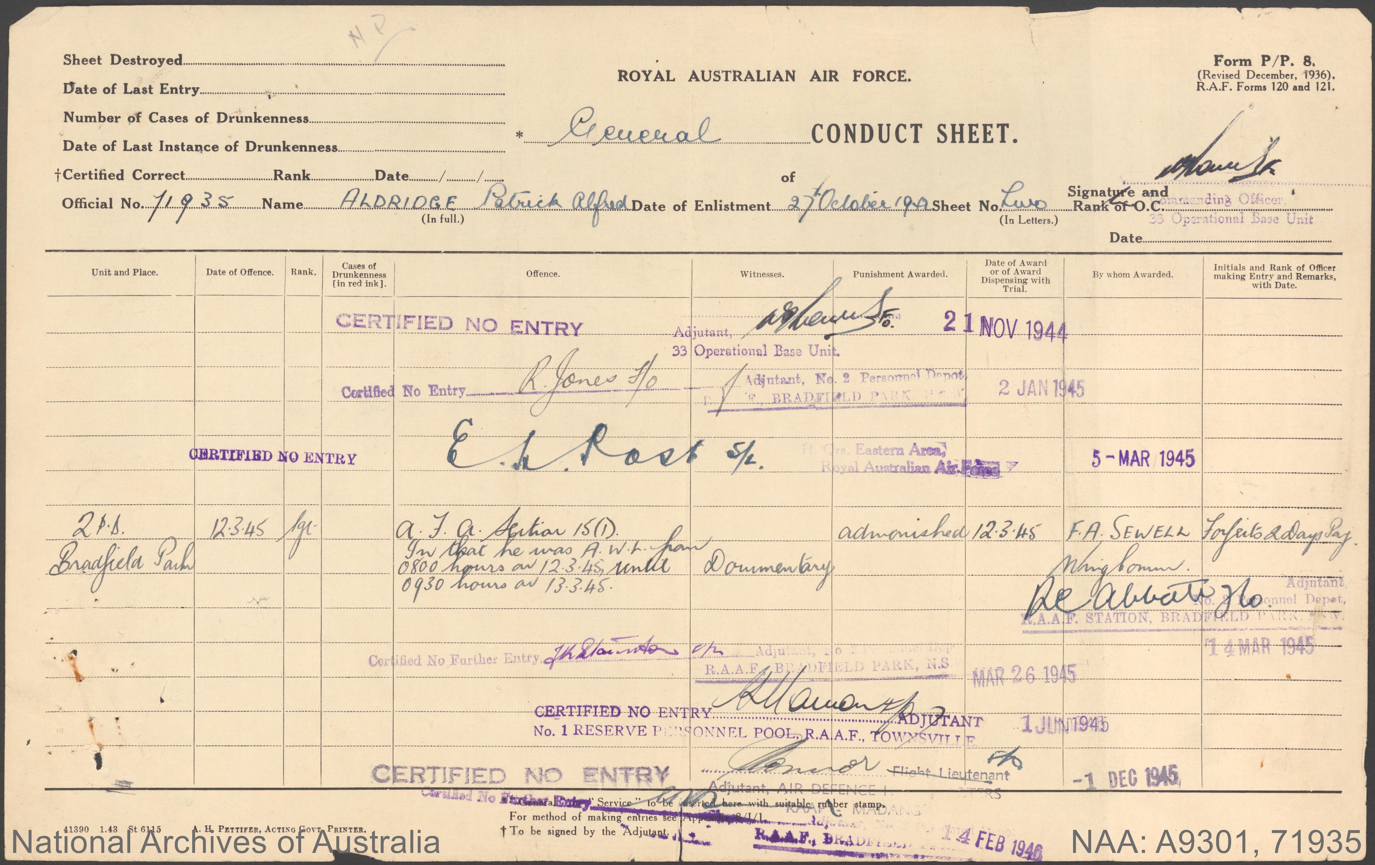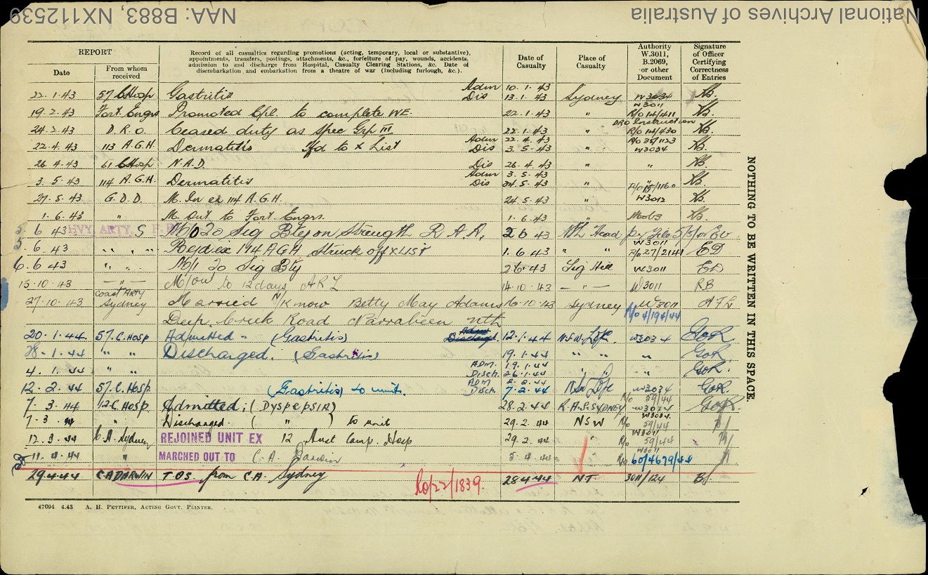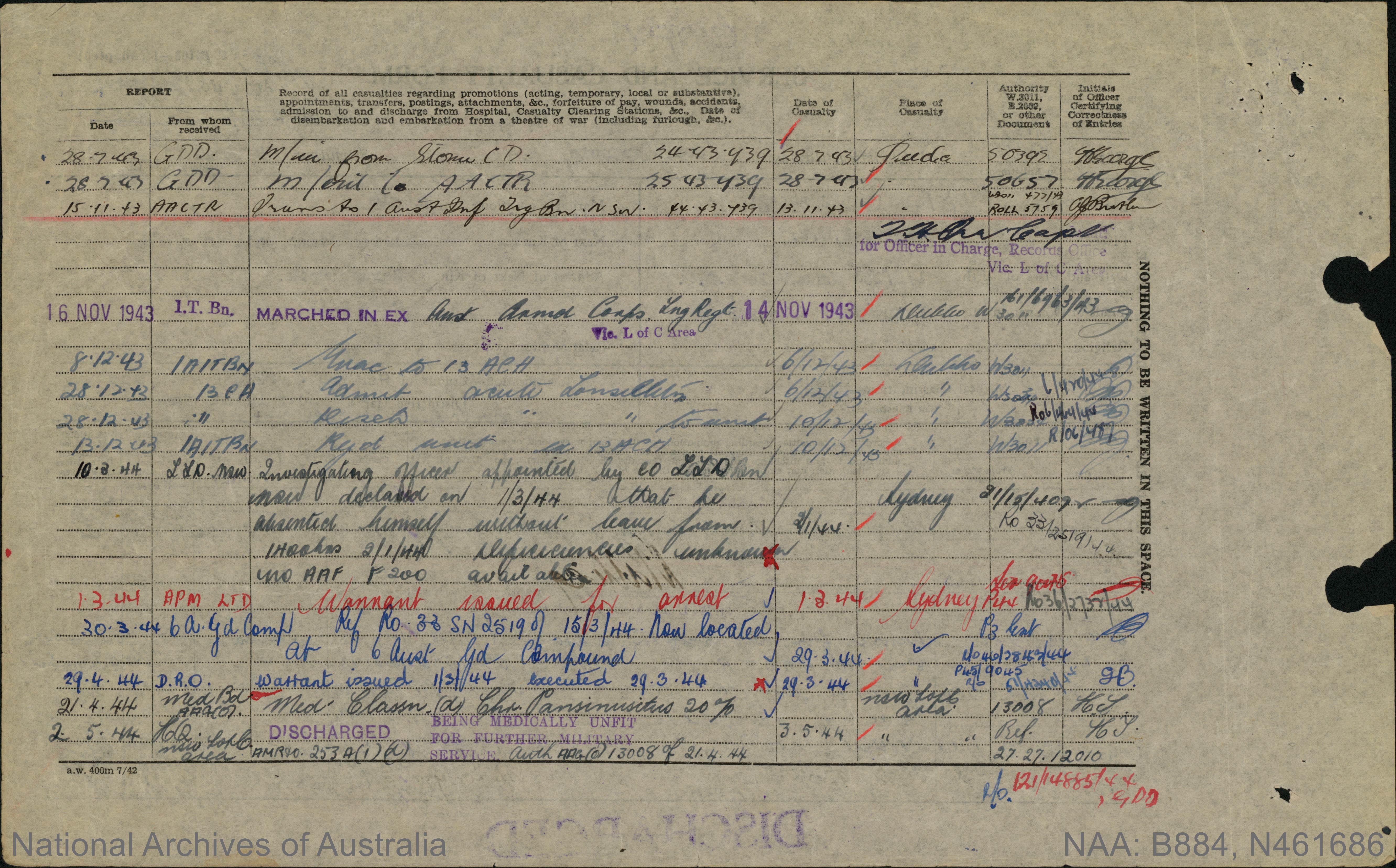On 17.11.1942 he is charged with ‘neglected to obey standing orders’ ands also went AWOL again, for a whole day. On January 267th 1943 he faces a Court of Inquiry held at ‘Georges Heights, whereat the court decrees he illegally absented himself from 21.12.1942 and is still absent. A warrant for his arrest his issued on 28.1.1943 for ‘absconding’. Charged £11-5-11.
