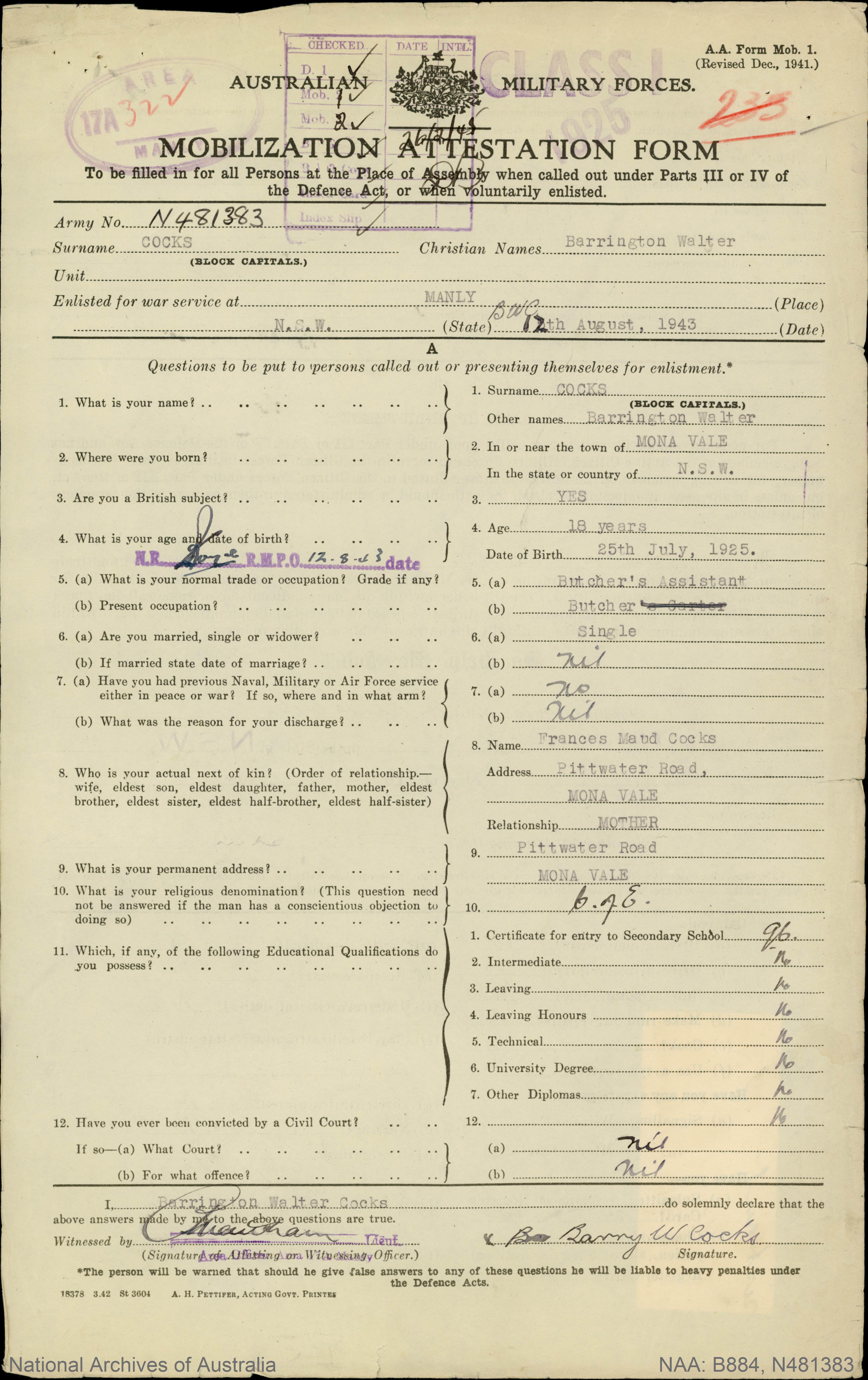 Another little remembered aspect was the application of what was 'Reserved Occupations' - if you brought food to people and in charge of an operation to do so, it was hard to sign up to serve - 'Barry' Cocks, enlisting as a teenager in the CMF was sent home until he was of age, then 21, as his trade was 'Butcher'.