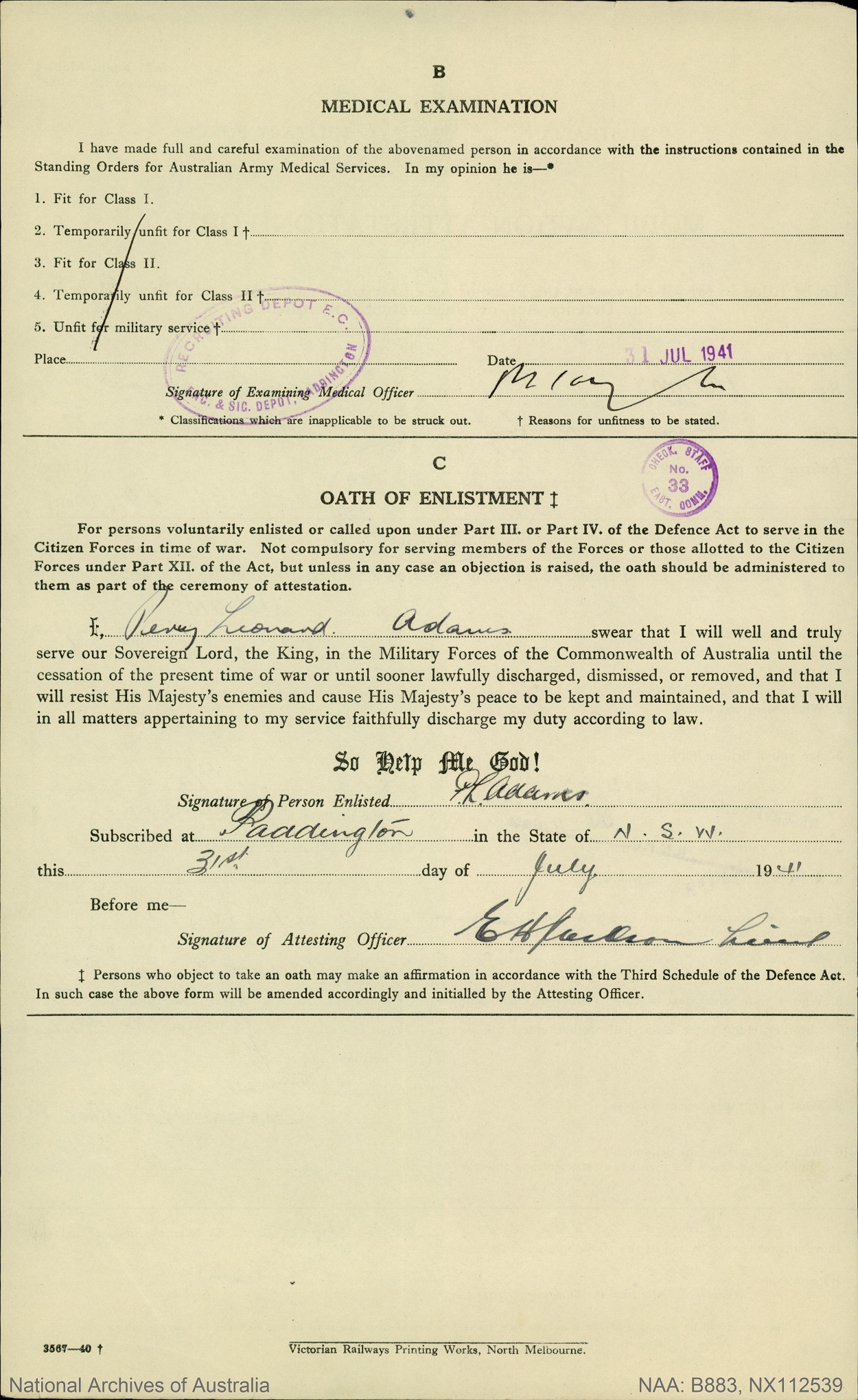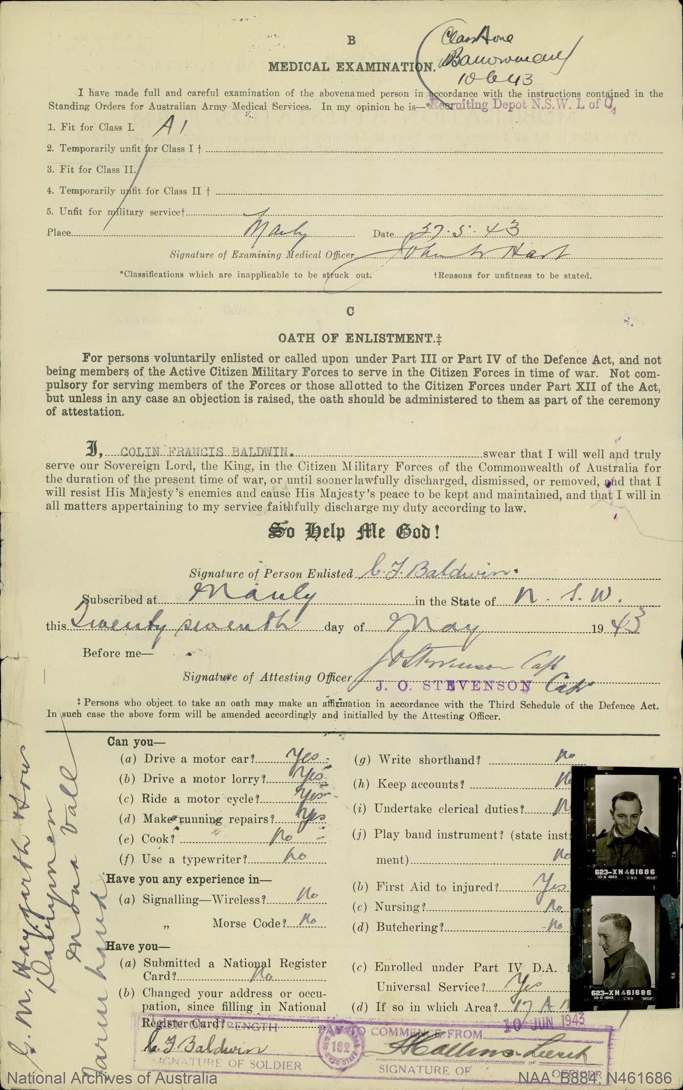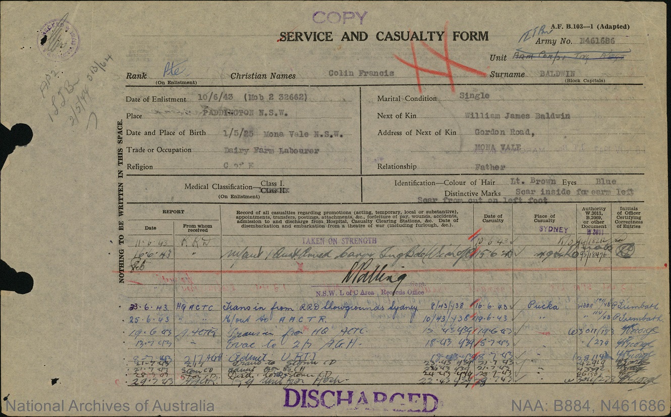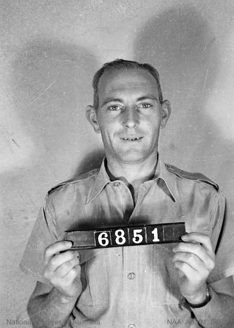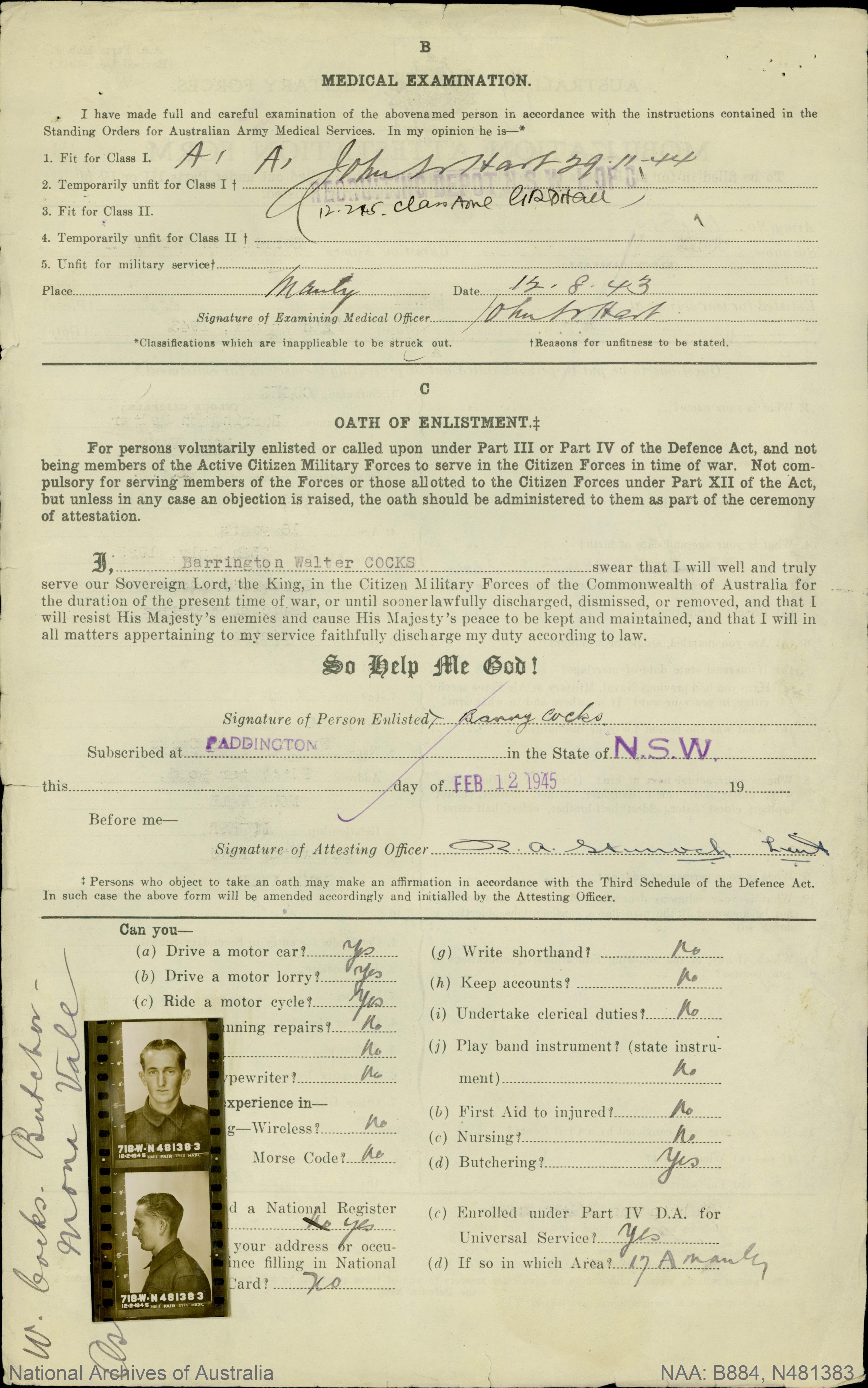 He had served as a seaman in the RAN prior to enlisting, again, on June 4th 1940. He served as a Gunner in 2/1 Australian Lt A A Regt. He is 6 feet tall, weighs 196 pounds, has fair hair, blue eyes, a fair complexion and a scar above his right eye and has tattoos on both arms and hands.
