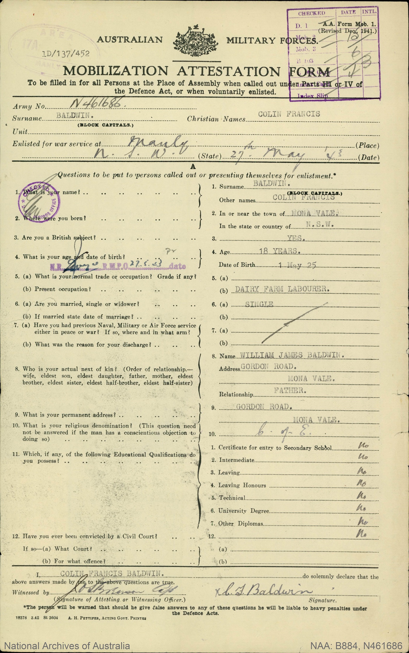 Ernest Maxwell Bourke of Bayview road Mona Vale, a ‘Machine Drill Man’ as occupation and aged 30 years and 9 months, born August 29th 1909 at Mona Vale NX20210.