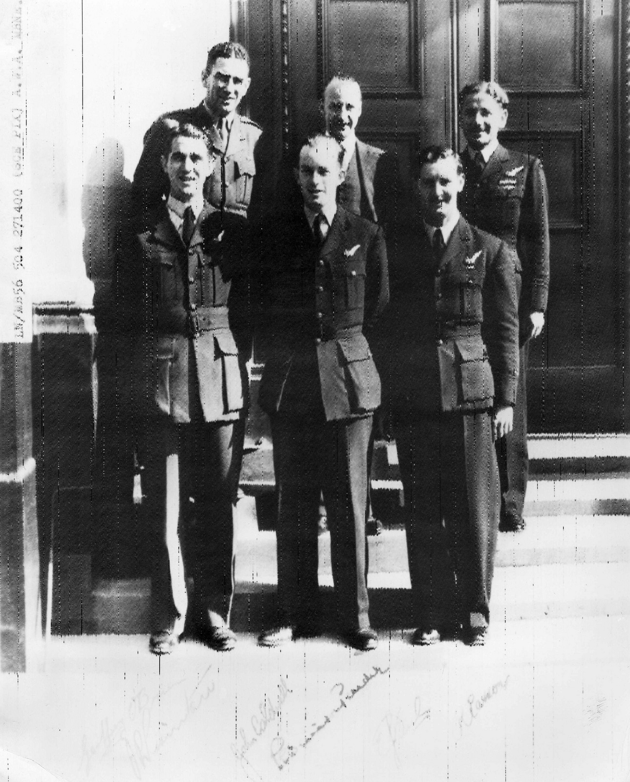 R.A.A.F. EX PRISONERS OF WAR PHOTOGRAPHED ON ARRIVAL LONDON OFFICE OF CABLE AND WIRELESS LTD TO EXCHANGE BEAM WIRELESS MESSAGES WITH NEXT OF KIN IN MELBOURNE AND SYDNEY LAST NIGHT. circa 1945 Group portrait, two rows od three. Back row from left: J. P. Swinton, of Warrnambool, Victoria; joint managing director, Cable and Wireless Ltd, Honourable J. J. Denison-Pender, of London; and, Flight Lieutenant Ron Easson, Narrabeen, N.S.W.. Front row: Flight Officer Geoffrey O'Brien, Mosman, N.S.W.; Flight Officer John Caldwell, Homebush, N.S.W.; and, Pilot Officer Eric Earl, Fairfield, Victoria. Setting in front of large door, back row on second step of stairwell. from Argus Newspaper Collection of Photographs, State Library of Victoria, Item: FL15971893