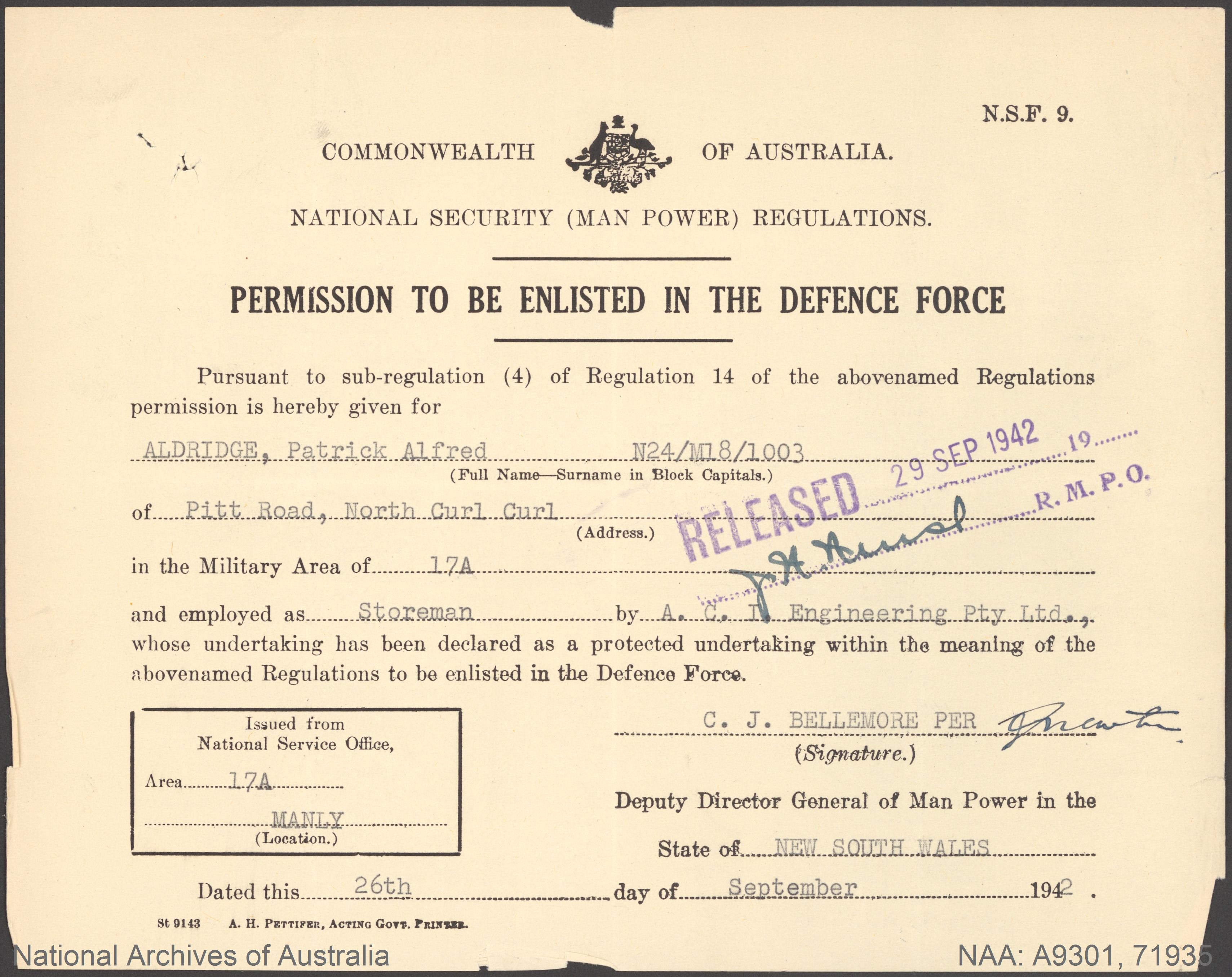 Some of the Yugoslavian men of the Warriewood valley would also have a few problems signing up to try and help those who were defending their family members in Europe as they too were in a vital service. The raising of the Women's Land Army may have helped them to enlist, but there were still some who were rejected on other grounds. For instance, other locals who were a 'Fitter' or in some other skilled trade that would be required to build the ships and airplanes used in defence of Australia would also be seconded into those trades to help in their fields, and shifted out of the AIF.