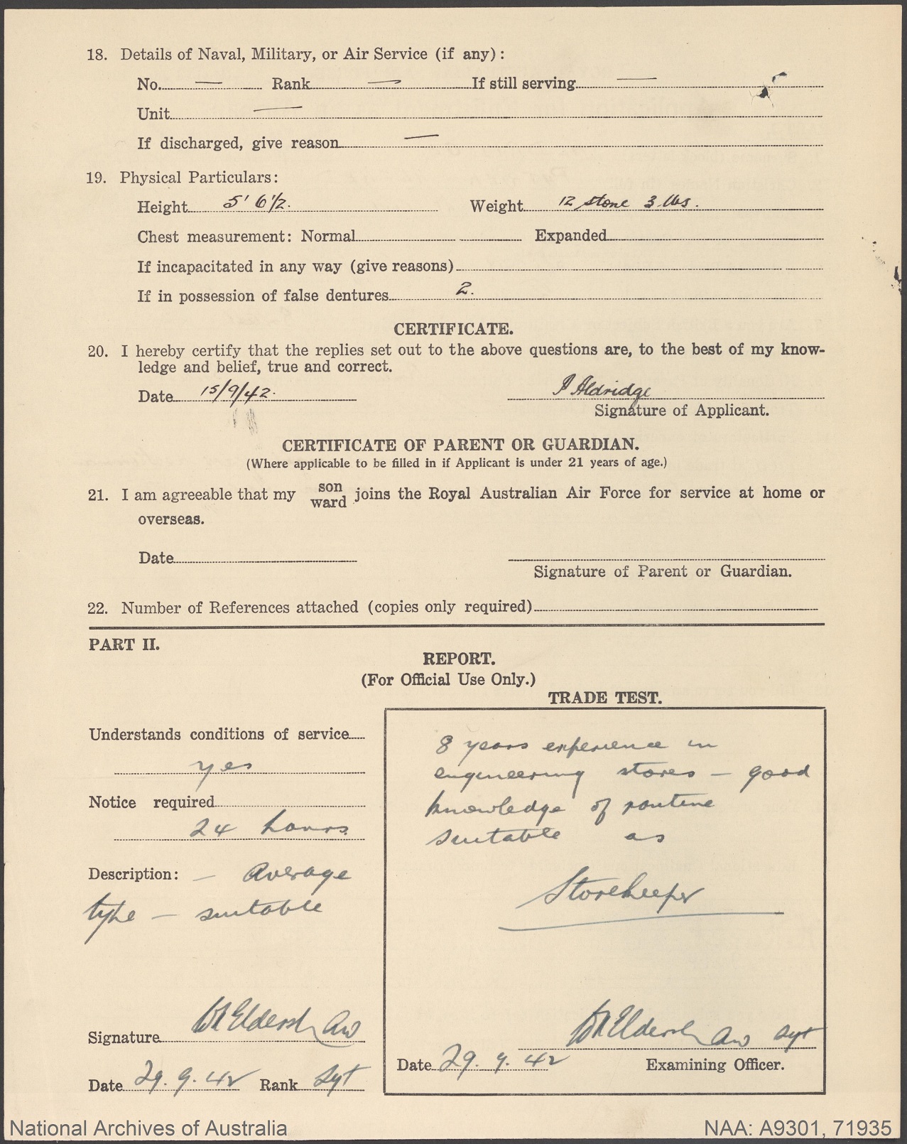 I went in in 1942, which was a bad year for Australia. Darwin was bombed then, the Japanese were making their way closer to Australia. All I wanted to do was get a gun and go and do something. I was only 17, so I changed my date of birth to go in, and I got in alright but then of course they found out. And they said, well, you can go away and come back in a year’s time, and I thought, well that’s no good, we might be overrun by then, or, they said, we can put you in the Financial Area and you’ve got to go home to your mother every night. So I chose to do that.