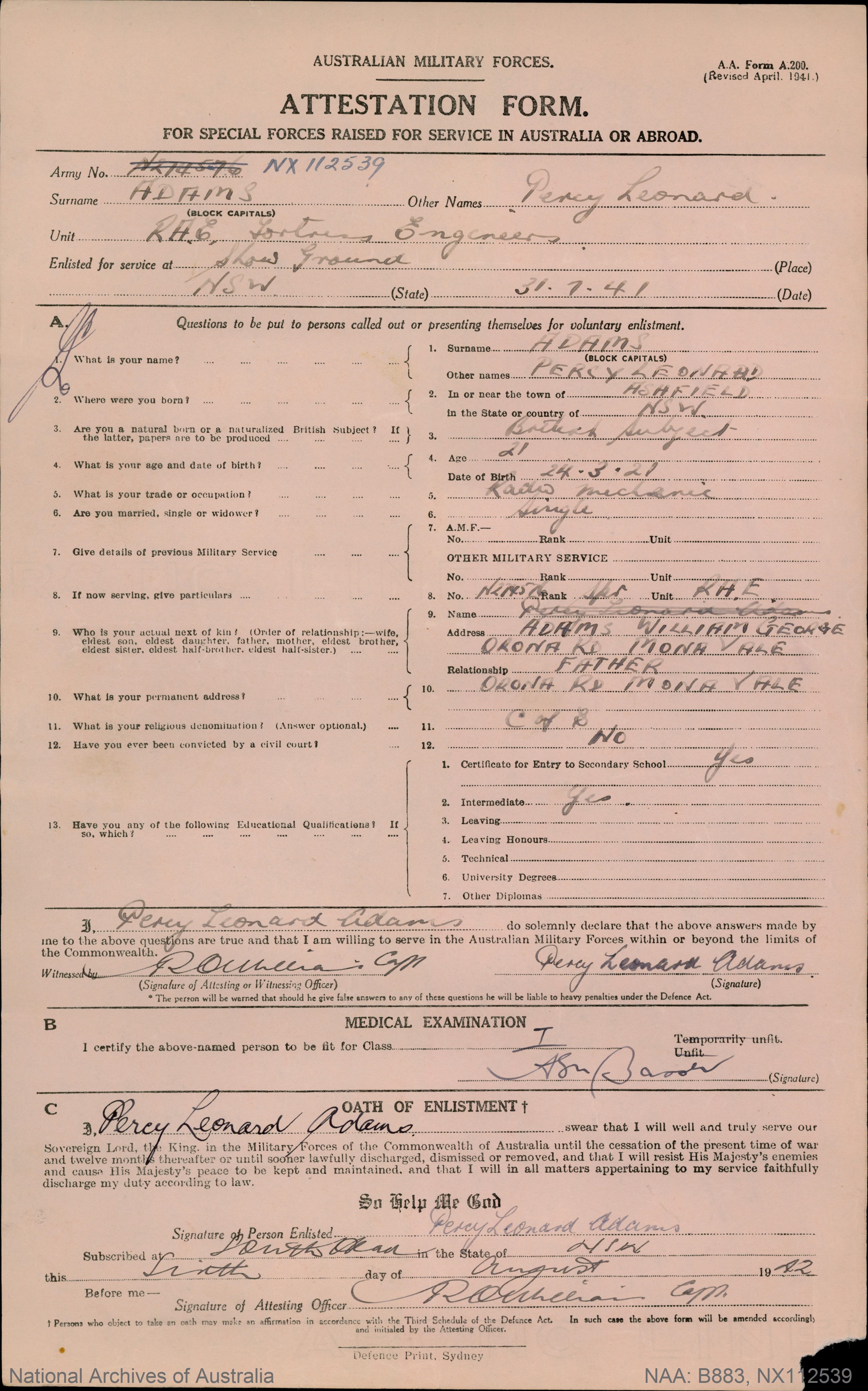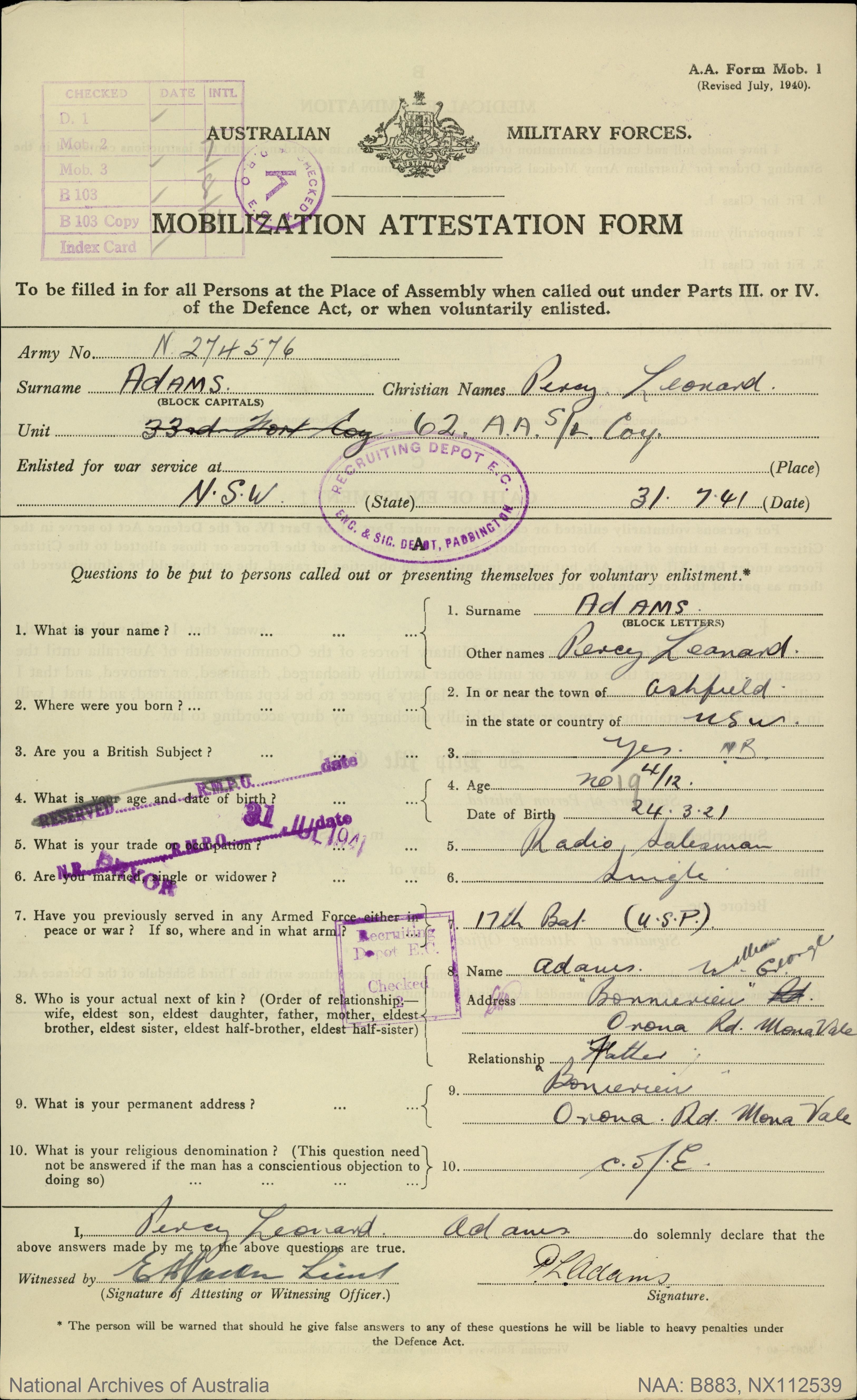 Percy. Pte. R. E., NX9539, Mosman, Inf.