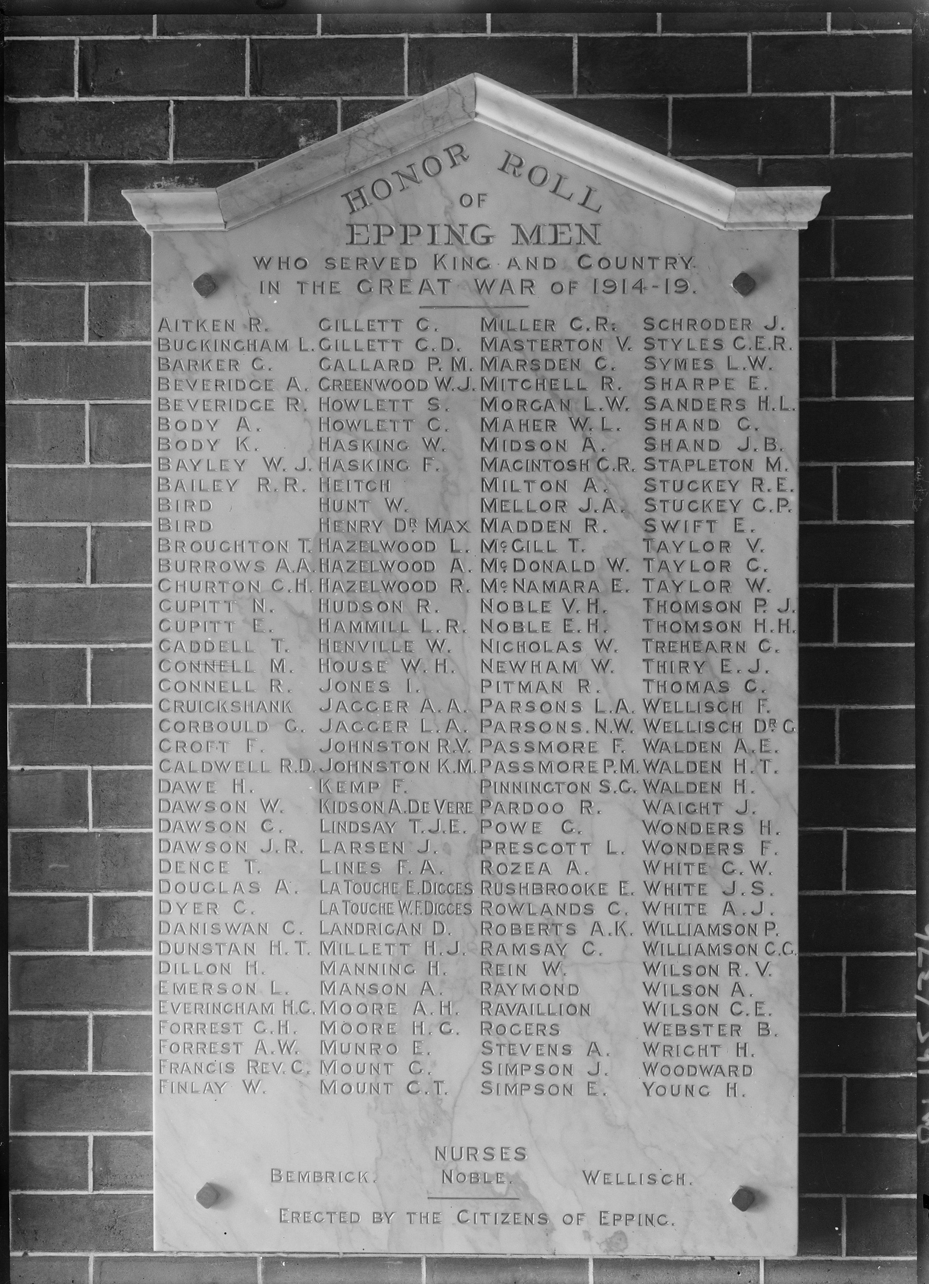 Photo: Honour Roll of Epping Men who served in war 1914-1919 by Rex Hazlewood - NB: Rex and his brothers Arnold and Leonard Willoughby Hazlewood are listed as all three served. Photo by Rex Hazlewood, Item: SLNSW_FL3806389, courtesy State Library of NSW. The AWM has [Australian War Memorial registry files, first series] "Sydney Mail" - Photographs received by mail through Mr R. Hazlewood presented to AWM in 1920 - the State Library of NSW has an extensive collection of his WWI 1914-1919 photographs taken while he served, from being in camp at Sydney Showgrounds and Kiama, the ship and troops entertaining each other while being transported overseas, to ceremonies held in England at the end of the conflict, including parades of all Commonwealth forces.