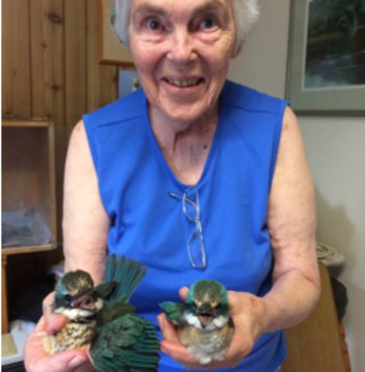 Top left: swamp wallaby joey with his carer, Lynleigh. Top right: juvenile sacred kingfishers with their human mum, Margaret. Bottom left: flying fox pup attached to his human mum, Lisa. Bottom right: lorikeet chick.