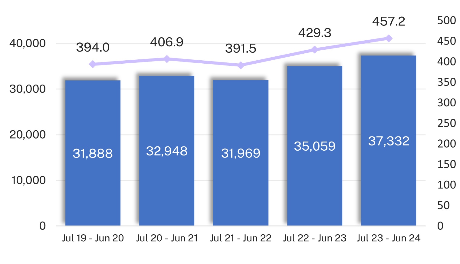 The chart below shows the number and rate of domestic violence related assaults recorded by the NSW Police.