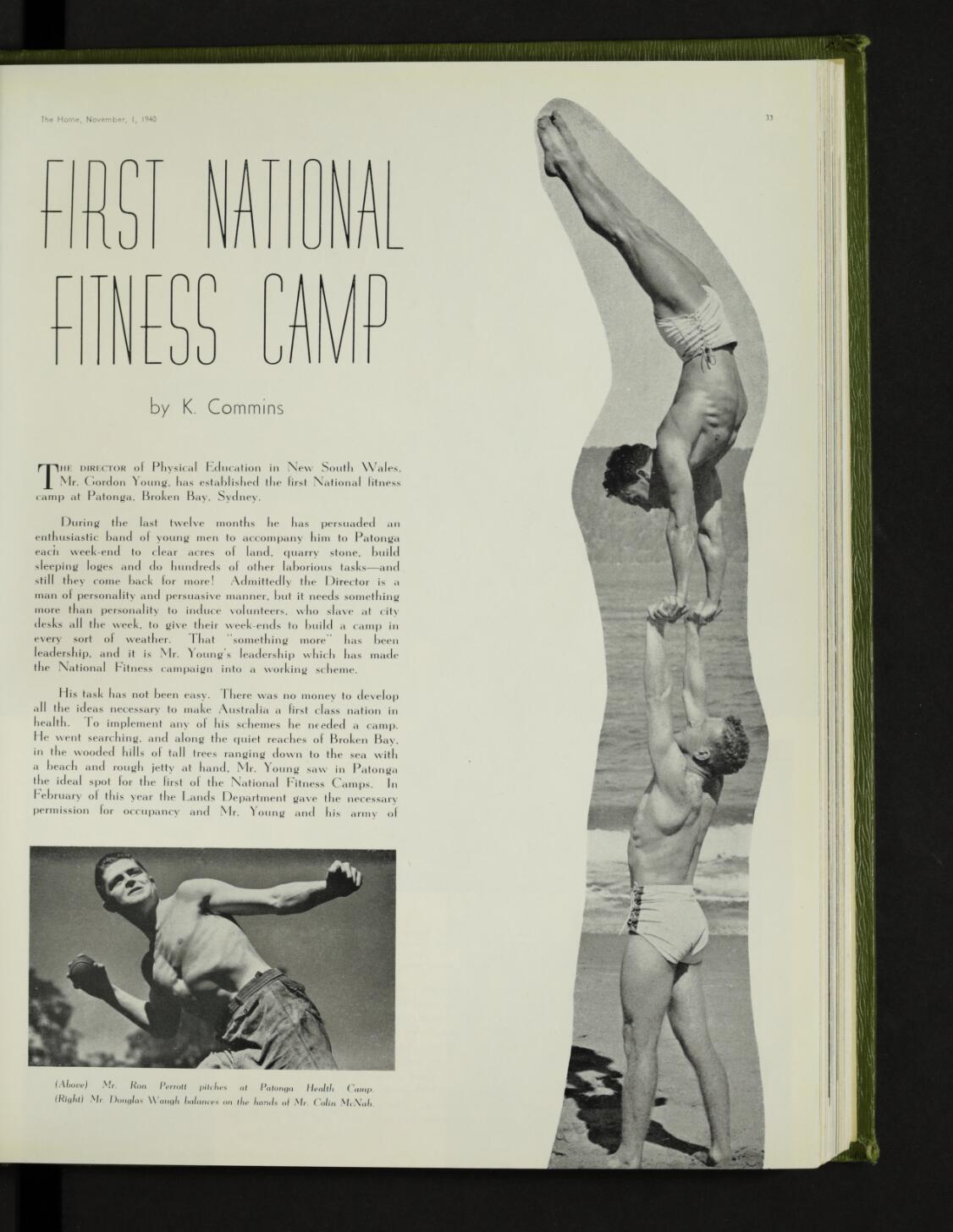 The director of Physical Education in New South Wales, Mr. Gordon Young, has established the first National fitness camp at Patonga, Broken Bay, Sydney. During the last twelve months he has persuaded an enthusiastic band of young men to accompany him to Patonga each week-end to clear acres of land, quarry stone, build sleeping loges and do hundreds of other laborious tasks—and still they come back for more! Admittedly the Director is a man of personality and persuasive manner, but it needs something more than personality to induce volunteers, who slave at city desks all the week, to give their week ends to build a camp in every sort of weather. That something more has been leadership, and it is Mr. Youngs leadership which has made the National Fitness campaign into a working scheme.